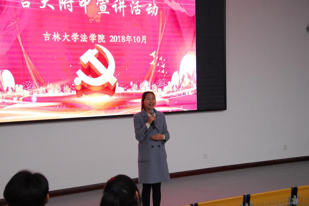 2018年10月22日下午,红色传人培育基地“德润学堂”学员、红色传人宣讲团成员赵硕、王珂馨、张弛、张俏、王佳菲五名同学为吉大附中的同学们带来一次形式新颖、内容丰富的党史国情宣讲活动。吉大附中团委老师、初一初二近百名学生认真聆听了本次宣讲。