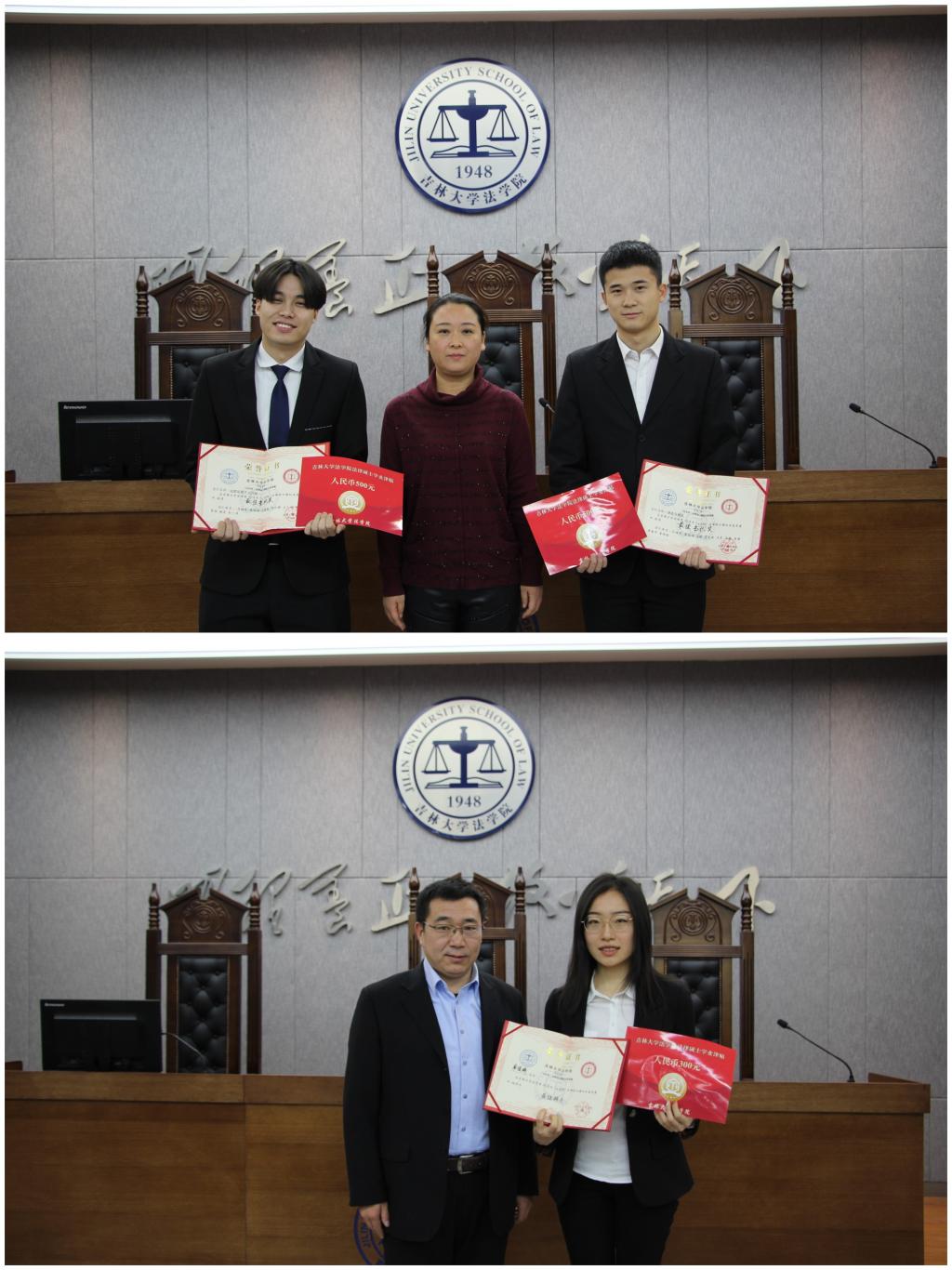 党委副书记徐杰老师向现场嘉宾与同学们宣布了本场竞赛的获奖队伍和队员后进入颁奖典礼。王立国老师为获得本届模拟法庭竞赛优秀队员奖的李璐、单佳琦、徐晖、刘莹、高艺琪、邵学颖、刘泽宇、许超、王乙渊和陈一鸣等10位同学颁奖;高宇老师为获得最佳风采奖的李璐同学和刘泽宇同学颁奖。