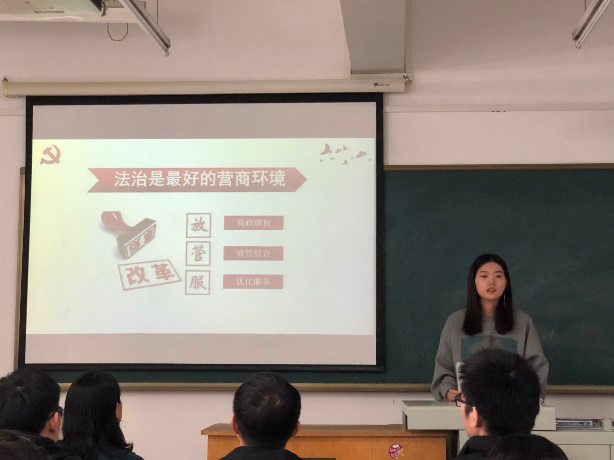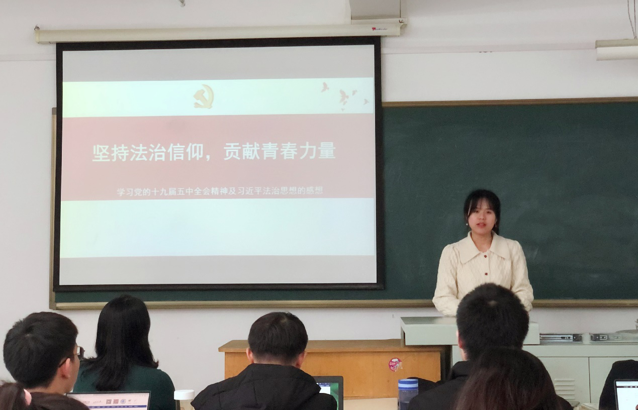 接着,入党申请人吴云同学和宋如梦同学分别以“防止资本无序扩张视域下区块链3.0时代的法律规制”和“青春新征程,奋进十四五”为主题发言,分别从具体问题和宏观视角切入,汇报她们结合专业知识自觉学习党的理论的成果,用实际行动表明自己入党的决心和信心。