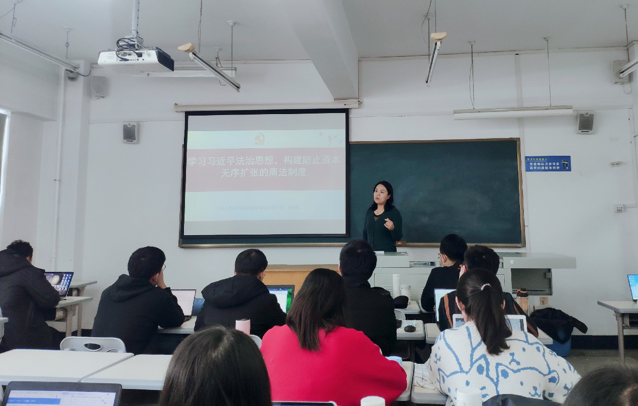 首先,王艳梅老师以“学习习近平法治思想,构建防止资本无序扩张的商法制度”为主题进行专题授课。王艳梅老师从商法学专业视角出发,结合党的十九届五中全会精神和中共中央政治局2021年经济工作会议精神,深刻剖析了习近平法治思想的内涵,深度解读了习近平法治思想对于商法学研究和商法制度建构的重要意义。王艳梅老师指出,防止资本无序扩张,能够彰显中国特色社会主义制度的独特优势,也是我国商法制度构建必须长期坚持的底线。随后,王艳梅老师从“构建防止资本无序扩张的商法制度之理论起源”、“构建防止资本无序扩张的商法制度之制度基础”和“构建防止资本无序扩张的商法制度之指导思想和具体规范”三方面展开具体阐述,从经典著作的新解读中明晰问题,在中国历史积淀和改革经验中探寻根基,让党的领导贯彻构建防止资本无序扩张的商法制度的全过程和各方面。