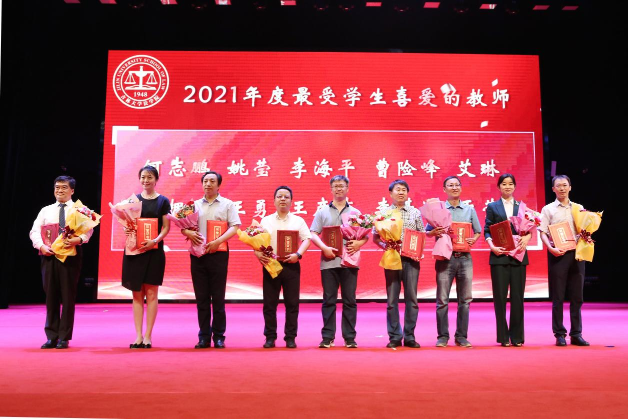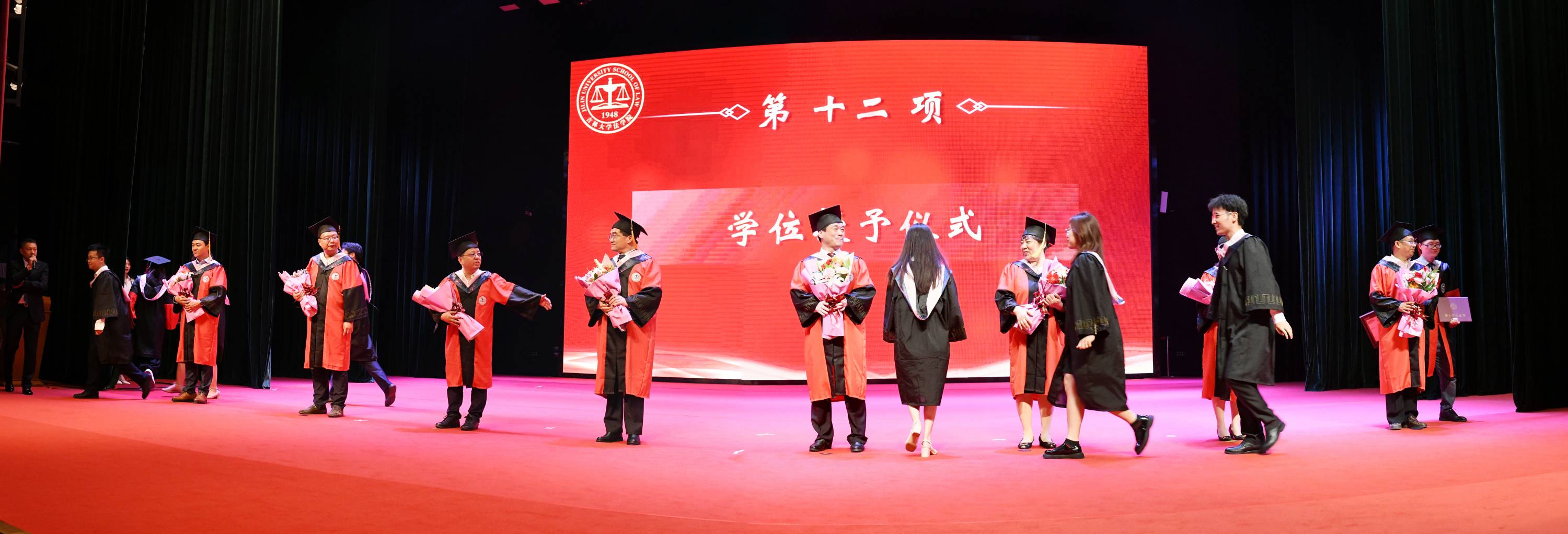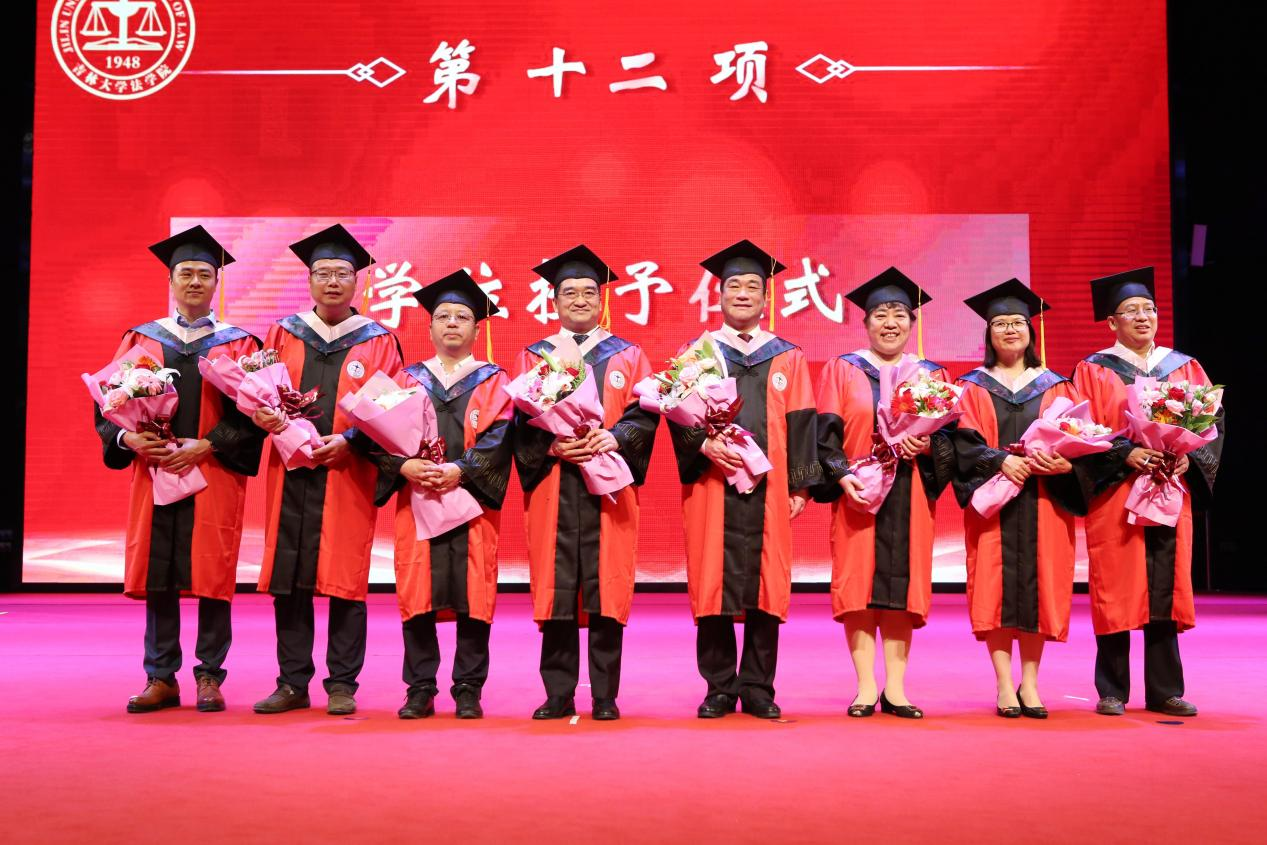 副院长刘晓林教授宣读毕业生名单后,院长何志鹏教授、院党委书记周春国教授、法学学位评定分委员会副主席张旭教授、校政策与法规办公室主任任喜荣教授、理论法学研究中心主任兼副院长杜宴林教授、副院长曹险峰教授、王充教授、刘晓林教授等八位主礼教授登台为毕业生拨穗授位,获得学士、硕士、博士学位的2021届毕业生们依次登台接受拨穗礼。