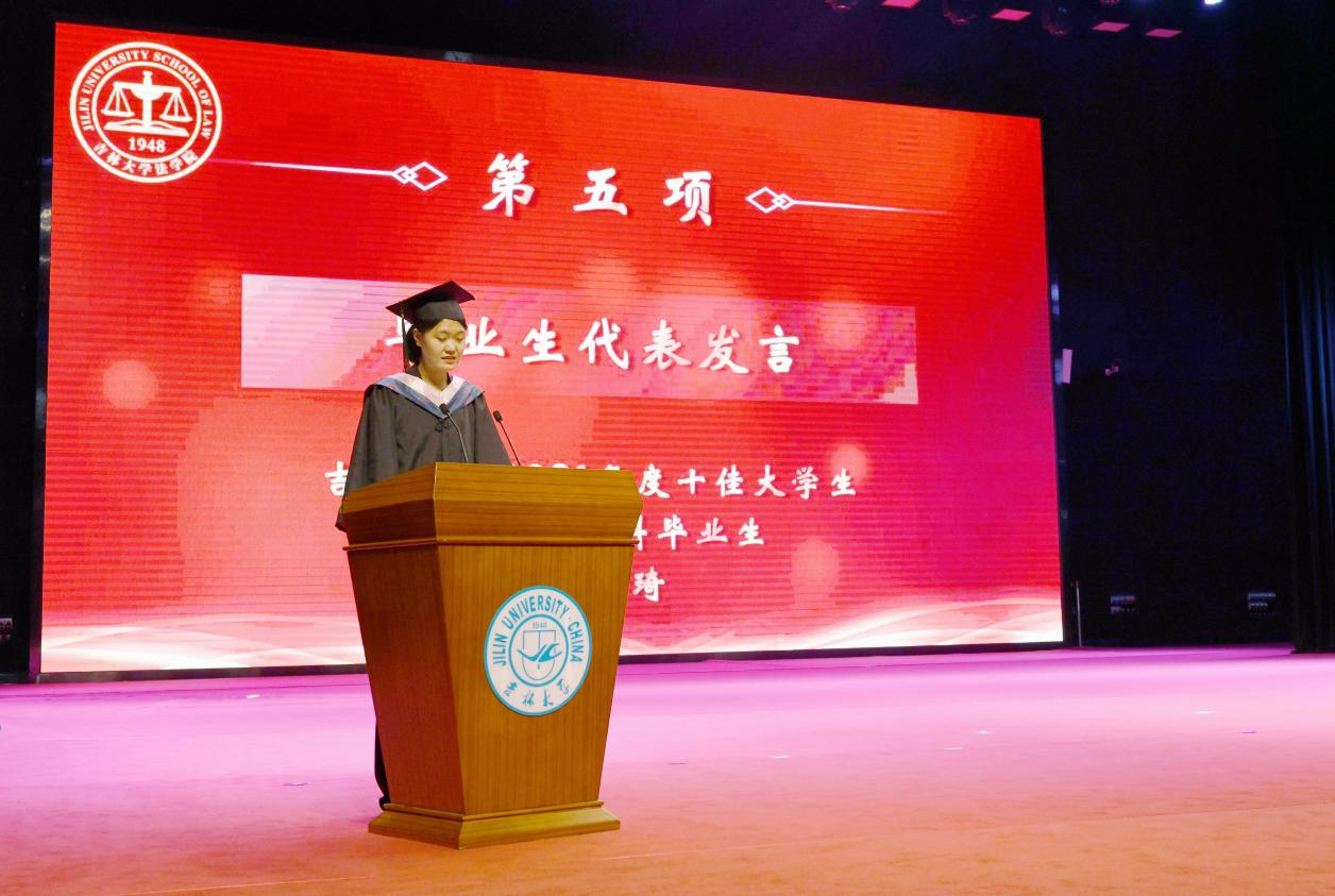 校务委员会副主任,财产法研究中心主任房绍坤教授作为教师代表致辞。他以“风物长宜放眼量”为主题,与同学们分享了对当代社会“内卷”与“躺平”的看法。他勉励同学们要放眼将来,志存高远,拒绝“内卷”与“躺平”,带着吉大法学的荣耀与希望,奔赴自己的星辰大海。