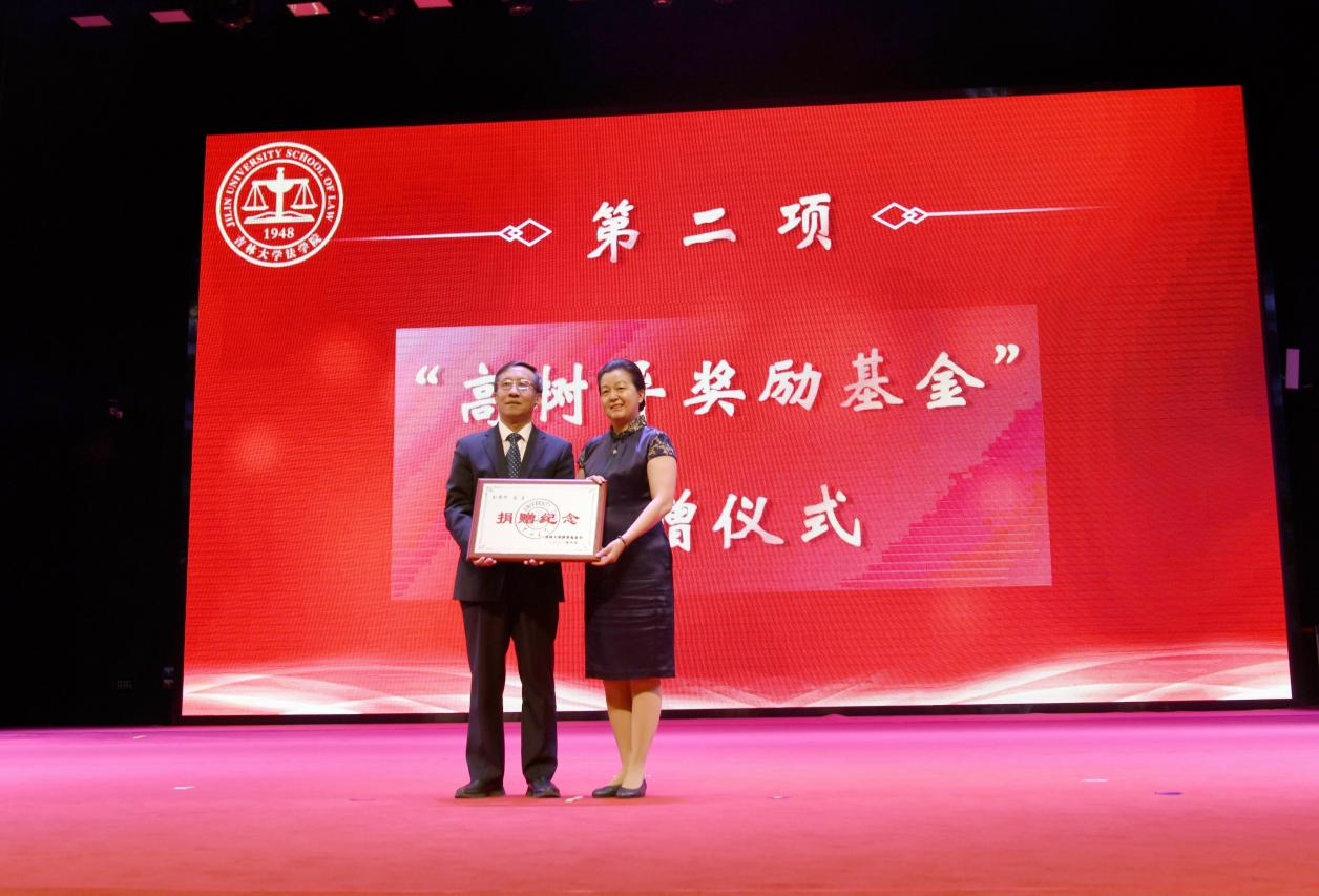 国际法学科的开创者和奠基人。高树异先生逝世后,他的亲属继续传承和弘扬先生的育英精神和对母校事业发展的关心热爱,特捐赠人民币一百万元设立“高树异奖励基金”,助力吉大法学的学科建设和人才培养。副校长边铁代表学校接受捐赠,并向高树异先生的学生代表刘亚军教授颁发捐赠纪念。随后,全体师生共同观看了高树异先生的纪录片和高树异先生之子高言先生的寄语视频,深切缅怀了高树异先生的高尚品德和精神风范。