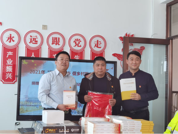 党课开始前,刘舰代表学院各教工党支部,向铁西村的全体党员村民捐赠了《中国共产党简史》和《习近平法治思想概论》,希望大家进一步学习党史、学习习近平新时代中国特色社会主义思想,凝心聚力,为铁西村全面振兴贡献党员的力量;向铁西村村党支部捐赠了部分急需的办公用品,让广大村民时刻看到学院对助力铁西村全面振兴付出的努力和帮助,时刻感受到来自学院广大师生的关心和温暖。