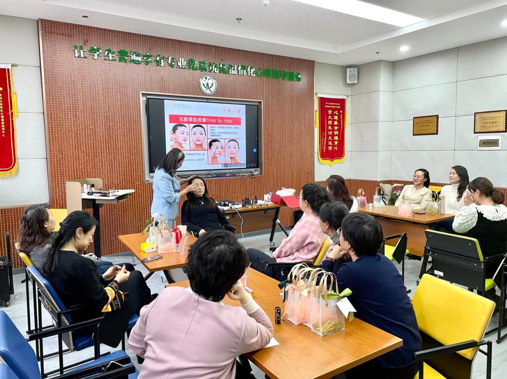 林丽女士从精油口红的制作步骤、选色原则、调制成分的用量和手工制作的注意事项等方面进行了详细的说明,同时普及了精油的养生功效。教师们认真聆听,兴致盎然,在指导下戴好一次性手套对烧杯进行消毒,按照程序先后倒入椰子基底油、选色添加色粉、均匀搅拌、加入蜂蜡、加热溶解、滴入精油搅拌、倒入模具、等待冷冻、装罐。在等待冷冻期间,林丽女士讲授并演示化妆的方法,同时分享了个人在美妆焕发活力提升气质方面的心得体会。教师们全情投入,既增进了工作之余的沟通交流,又舒缓了平日的疲惫与压力,为生活平添了一份明媚的色彩。当教师们怀着期待的心情打开装罐后的口红成品时笑靥如花,这份节日专属的礼物记录着手工制作的乐趣也蕴含着个人独特的审美追求。