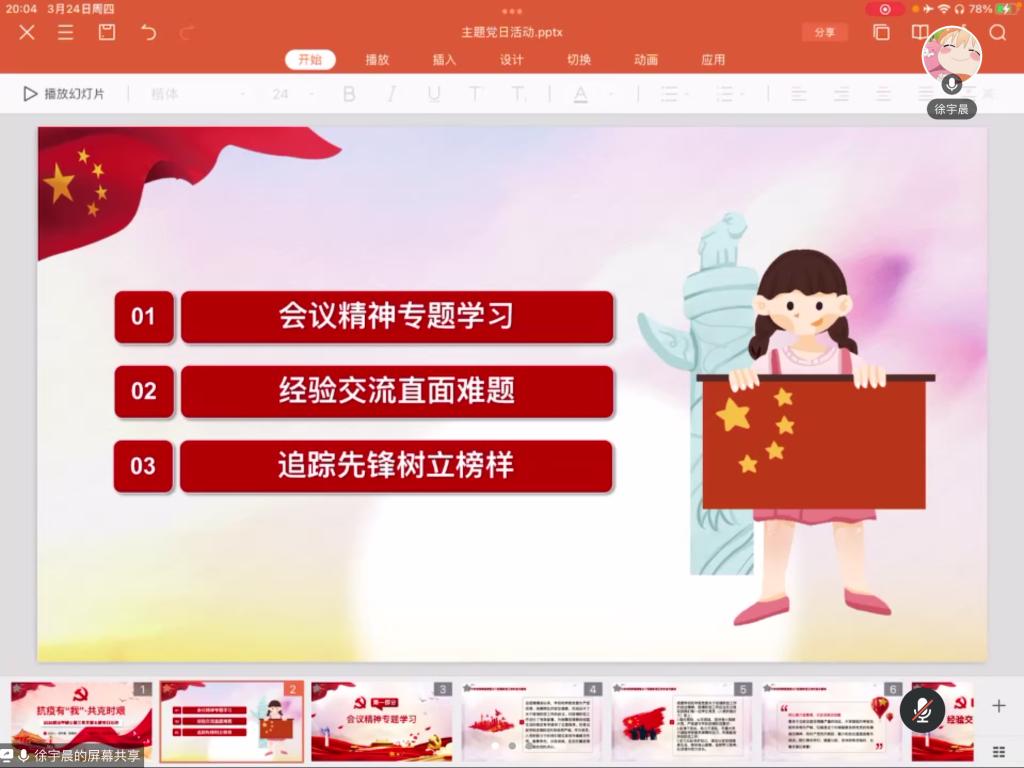 接着,支部纪检委员徐宇晨同志组织大家展开了专题学习,提出疫情防控工作应当充分落实到我们每一位学生党员和入党积极分子身上,同学们应当自觉做到以下三点:第一,强化规矩,心存底线,坚持舍小我顾大局,严格遵守学校疫情防控要求;第二,自律不放纵,助力不添乱,尽最大努力减轻学校服务保障的压力,积极配合学校防疫工作;第三,全力以赴保护自己,镇定从容安排隔离生活,保持身心健康,坚持学习思考,在逆境中努力成长。