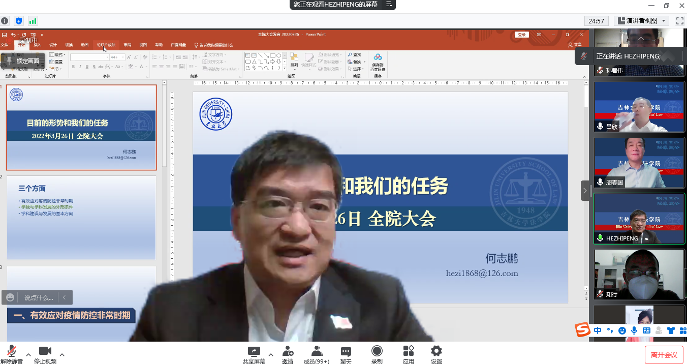 院长何志鹏聚焦学院发展,从三个方面明确学院面临的形势与面对的任务。第一,要有效应对疫情防控非常时期,做到非常态与常态的平衡,理解各级防控政策,保证自己和身边人员的身心健康,保持教学、研究、管理工作的常态运行,加强对学生的引领与关怀。第二,要积极把握学院与学科发展的外部条件,争取国家方面和学校方面的支持,拓展学院建设的资源与契机。第三,明确学科建设与发展的基本方向,勉励传统优势学科和新兴学科坚持深耕,齐头并进,及时调正个人科研研究方向、问题,与吉大法学、地区、国家研究方向和精神对标对表,体现出鲜明的优势和特色。