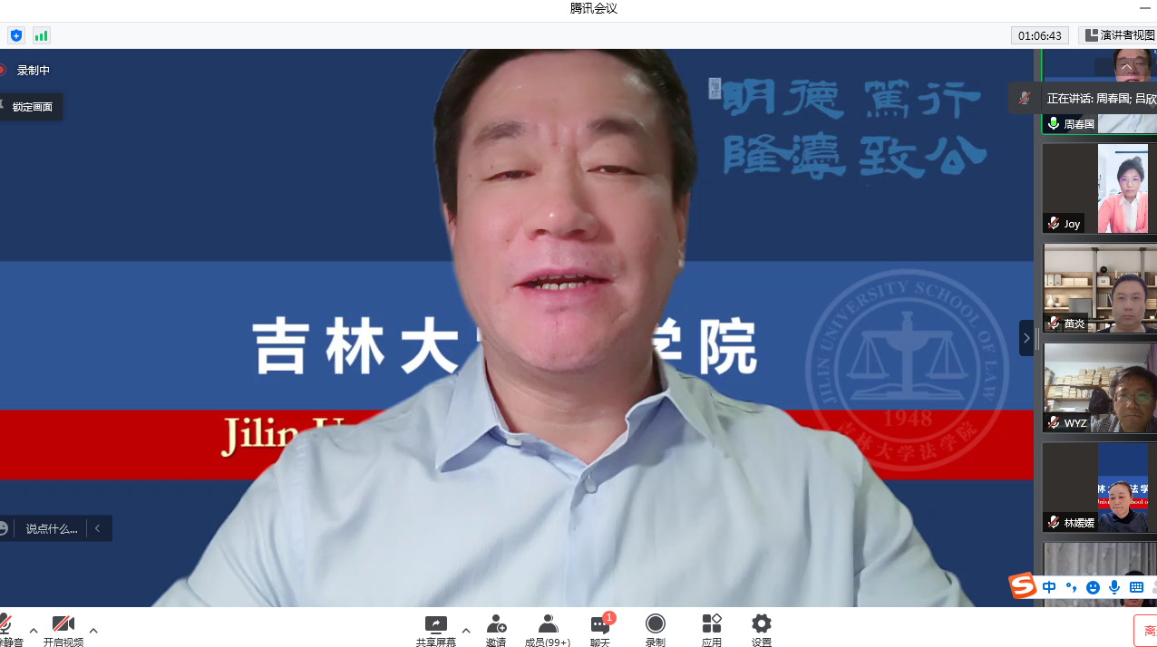 最后,书记周春国通报学校和学院整体抗疫情况,并对当前面临的局势提出进一步工作要求。周春国强调,在抗疫攻坚时期,要举全院之力做好多重保障工作,要多从学生主体的角度思考问题,多从学校全局的角度思考问题,更要坚持实施“四师建设工程”,发挥教师是学生成长导师不可替代的作用。具体而言,一要做到“一定要上好课”,用高质量的课堂教学和老师的学术魅力吸引学生,通过名师讲座等让学生有获得知识的成就感。二要做到“一定要引好路”,立德树人,德法兼修,要在课堂上实践课程思政,激励学生找准人生的方向,换种角度,将封寝也视为一种修行。三要做到“一定要爱好生”,研究生导师和本科生导师要了解学生所需,反映学生诉求,力所能及地帮助学生解决实际问题,加强亲学关系。四要做到“一定要带好头”,教师党支部要带头做好主题党日;老师个人要带头做好及时关注和反馈学院的工作安排,坚持实事求是地做好每日健康打卡;行政人员要带好头,做好管理和老师们服务保障工作,做好安全防火;辅导员要和老师们保持沟通,必须做到底数清楚,做到一人一策,一个不落。周春国嘱托全院教师,一定要与学生们同心、同向、同行,共同努力,用温情和付出打造吉大法学家园共同体,用真诚和爱陪伴学生们走过这段艰辛的心路历程。