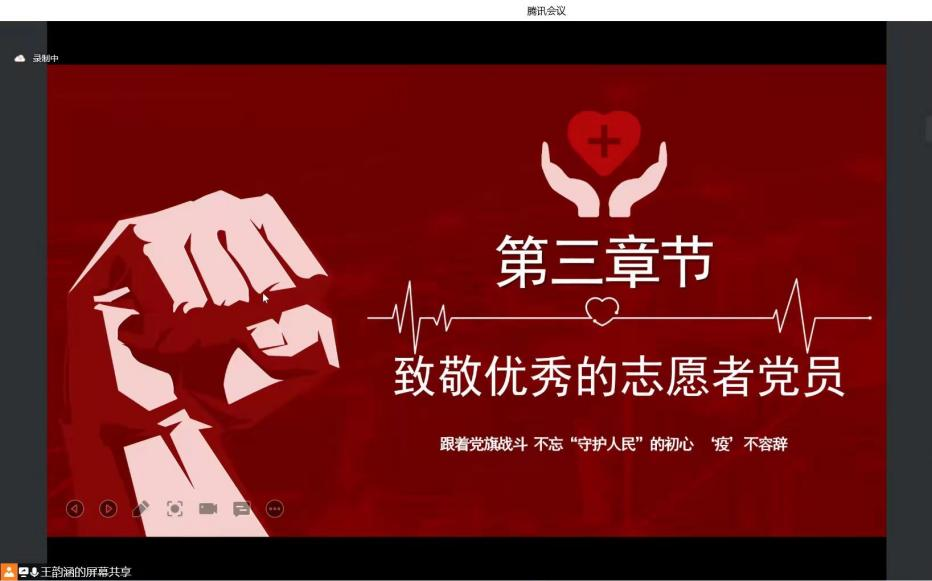 首先,支部书记王韵涵同志向大家传达了学校及学院关于疫情防控工作的会议精神,强调党员同志们要在严峻的疫情下担负起属地防控的重要责任,围绕疫情防控大局恪尽职守。同时,王韵涵同志开展专题学习,号召同学们凝聚力量,不畏困难,坚守守护人民的初心。