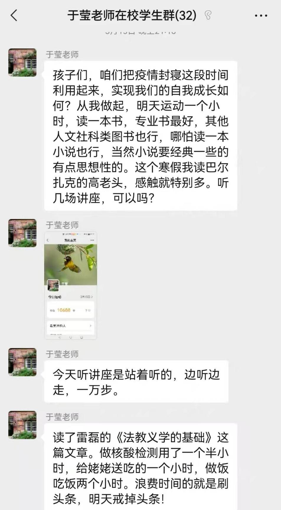 除了每周的师门会外,于老师时时刻刻也挂念着同学们,日常会随时和大家分享讲座、书籍、电影、运动等等,把积极的生活态度传递给每一个人,同学们也都充实地过每一天。