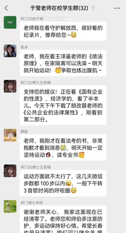 于莹老师也在这段特别的日子里,一直关心着师门同学的健康、心情和学习。在老师的带动下,每一个同学都在这段时期过得自律又充实。