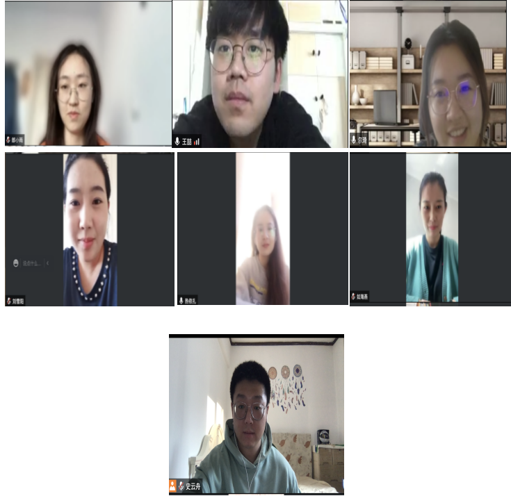 在抗击疫情的大背景之下,如何平衡学习与生活,调节焦虑与压力成为了每一位同学的必修课。在学术交流环节后,同学们分享起了舒缓身心的“小妙招”与近期见闻。位于寝室隔离的王源荟同学与王松林同学通过自身学习画画与韩语的经历鼓励大家在封寝期间进行个人兴趣爱好与能力的拓展。周广童同学谈到了自己在封寝期间通过阅读和看电影等方式营造乐观的心理状态。周雨彤和王喆两位同学讲述了独自在寝室生活的奇妙经历。索龙古、王帆两位同学分享了实习期间的趣闻与感悟。同学们通过视频交流的方式,向老师汇报近况,也对老师诉说着生活中、心理上遇到的确幸和波澜,虽然所念之人无法相拥、所感之事结在心肠,但是同学们却通过屏幕中的张张笑脸打破各自所在的小小“茧房”,深深拥抱师门这样一个大大的集体,从中汲取充沛的力量。