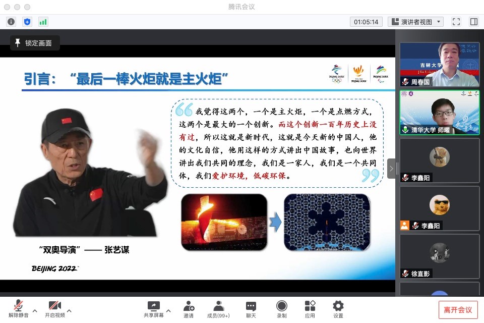 清华大学博士生讲师团讲师,“立言计划”优秀学员师曜同学与大家分享了自己作为北京冬奥会志愿者的活动经历。师曜同学以“最后一棒火炬就是主火炬”为切入,回顾了习近平总书记在北京冬奥会冬残奥会总结表彰大会上的重要讲话精神,揭示了习近平生态文明思想的生动实践和我国坚持集中力量办大事的制度优势。