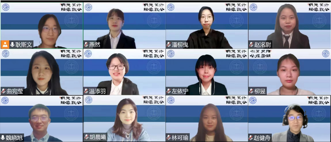 高度重视本届赛事,于2021年10月初开展队伍组建工作,由国际法学博士研究生魏晓旭担任教练,由国际法学硕士研究生耿斯文担任领队,以本科生燕然、赵洺尉、左依宁为上场队员,以本科生曲宛莹、温添羽为研究员,以本科生柳昱、潘柳曳、胡晨曦、林可瑜为队员,并由国际法学博士研究生赵健舟、法理学博士研究生陆玥提供赛事支持。
