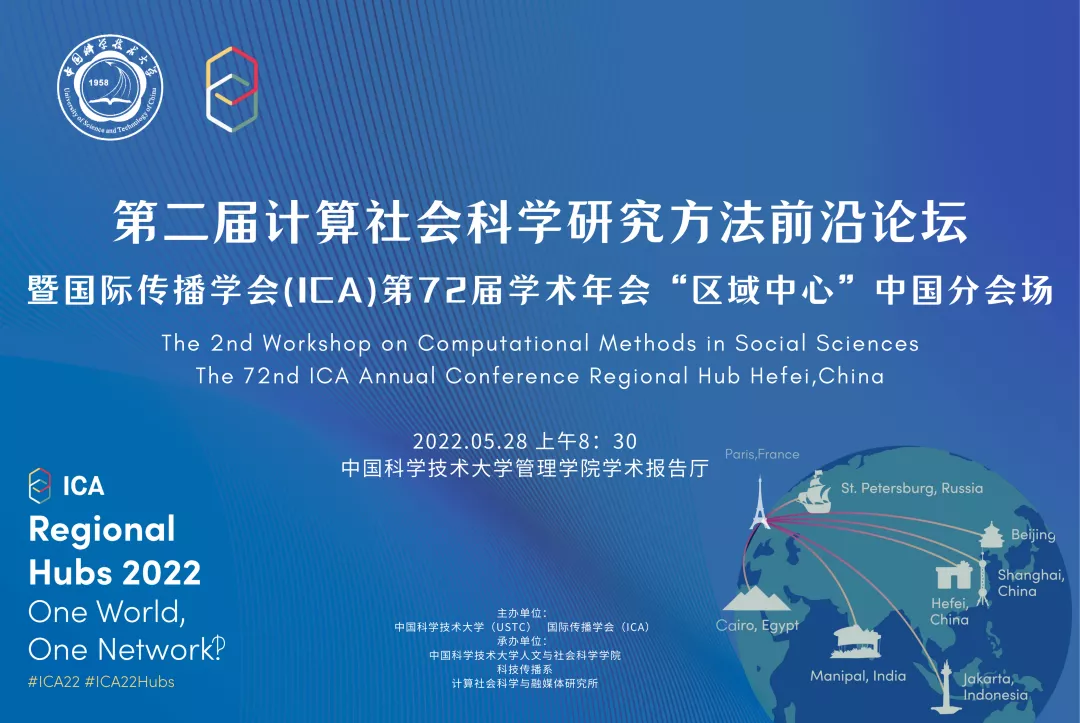 2022年5月28日-29日,由国际传播协会(ICA)、中国科学技术大学人文与社会科学学院主办,中国科学技术大学科技传播系、中国科学技术大学计算社会科学与融媒体研究所承办的“第二届计算社会科学研究方法前沿论坛暨国际传播协会(ICA)第72届学术年会‘区域中心’中国分会场”在安徽合肥中国科学技术大学召开。本次论坛以“计算社会科学视角下的中国”为主题,旨在增进学术交流与跨领域合作,彰显计算社会科学特色,以新颖视角看待与分析中国问题。来自清华大学、复旦大学、深圳大学、浙江大学、南京大学、中国科学技术大学、美国西北大学等国内外高校知名学者进行线上及线下专题报告,探讨计算社会科学领域的发展与未来。