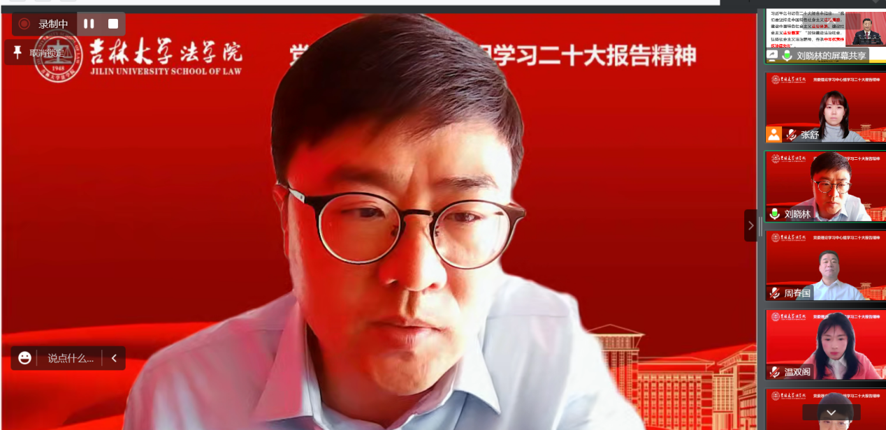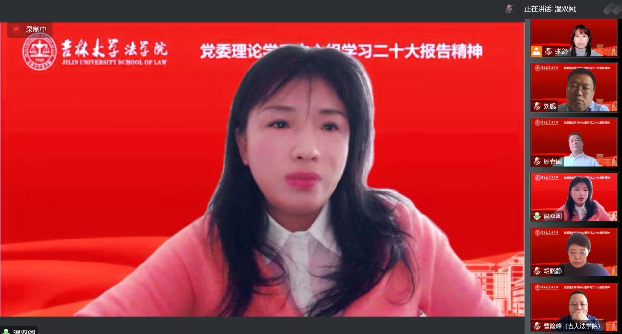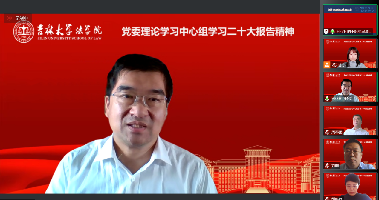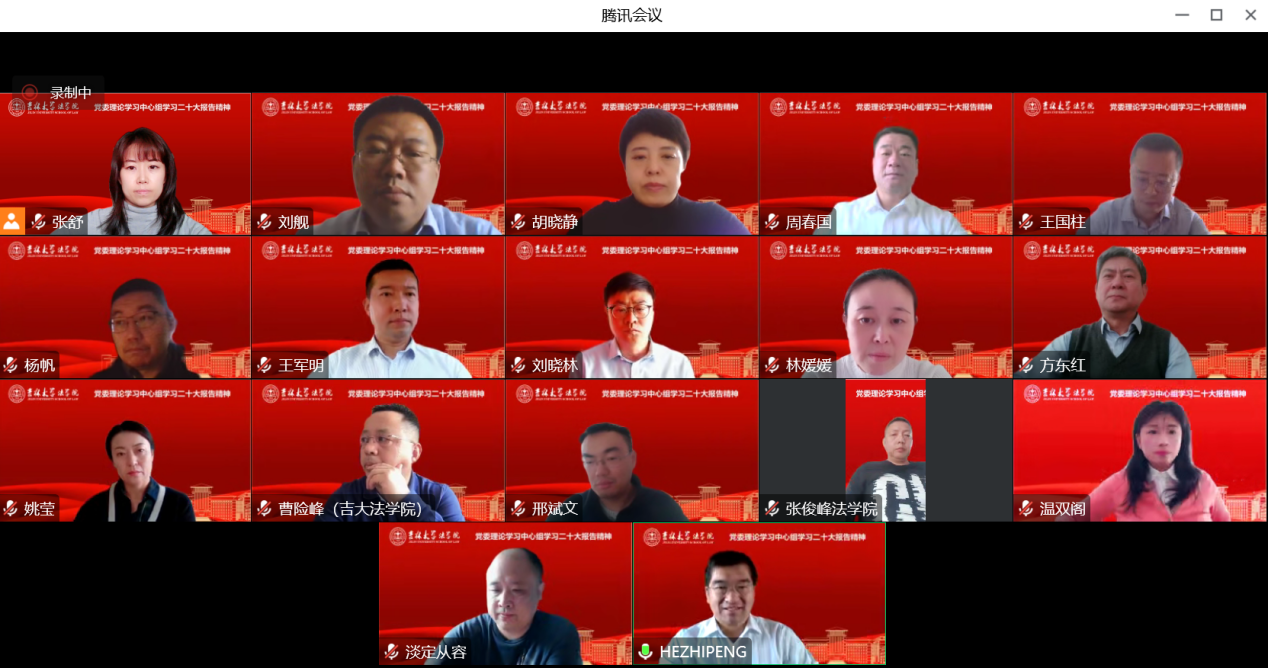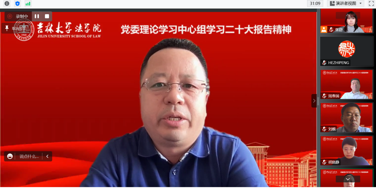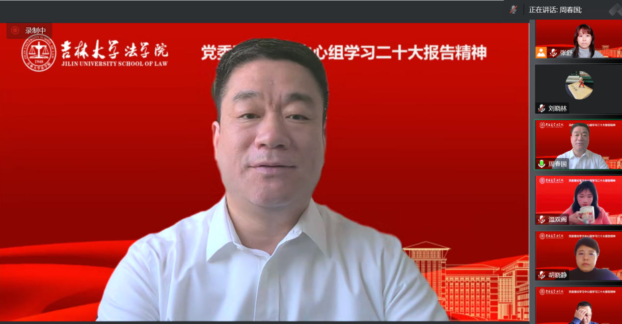 最后,周春国书记作总结发言。他指出, 党的二十大是在全党全国各族人民迈上全面建设社会主义现代化国家新征程,向第二个百年奋斗目标进军的关键时刻召开的重要大会,要深入学习贯彻领会党的二十大报告精神,增强政治认同和思想认同,强化政治担当与时代使命。习近平总书记报告中强调实施科教兴国战略,强化现代化建设人才支撑,与高校工作密切相关。围绕学院建设,他强调三点工作内容:一是学术研究工作要瞄准国家整体发展战略。做好中国式现代化理论阐释和实践表达,要加强比较研究,为完善中国式现代化制度体系提供理论支撑,向世界传达中国声音。二是要抓住法治国家建设机遇。拓展研究领域,围绕重点、新兴、涉外领域立法进行思考。三是要坚持为党育人、为国育才。要培养德智体美劳全面发展人才,做教研俱进、德艺双馨的大先生,弘扬吉大法学优良传统,涵养良好教学科研风气,立德树人发挥教师引领作用。