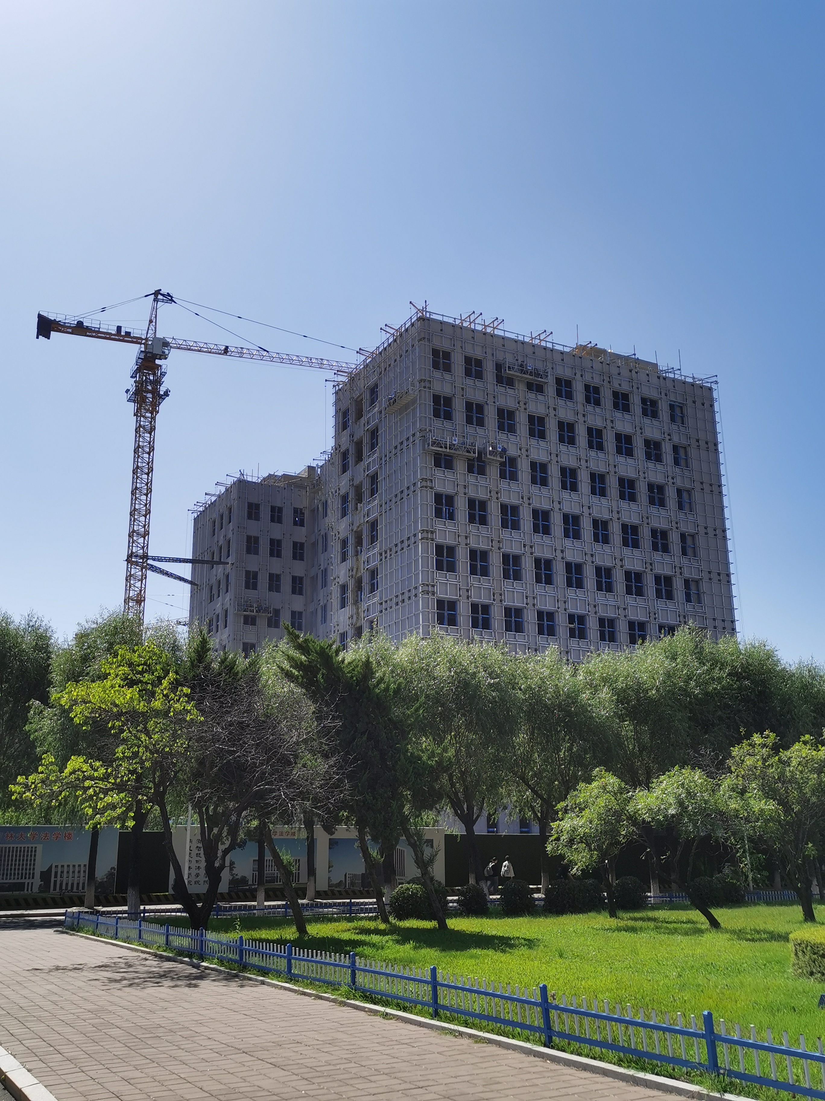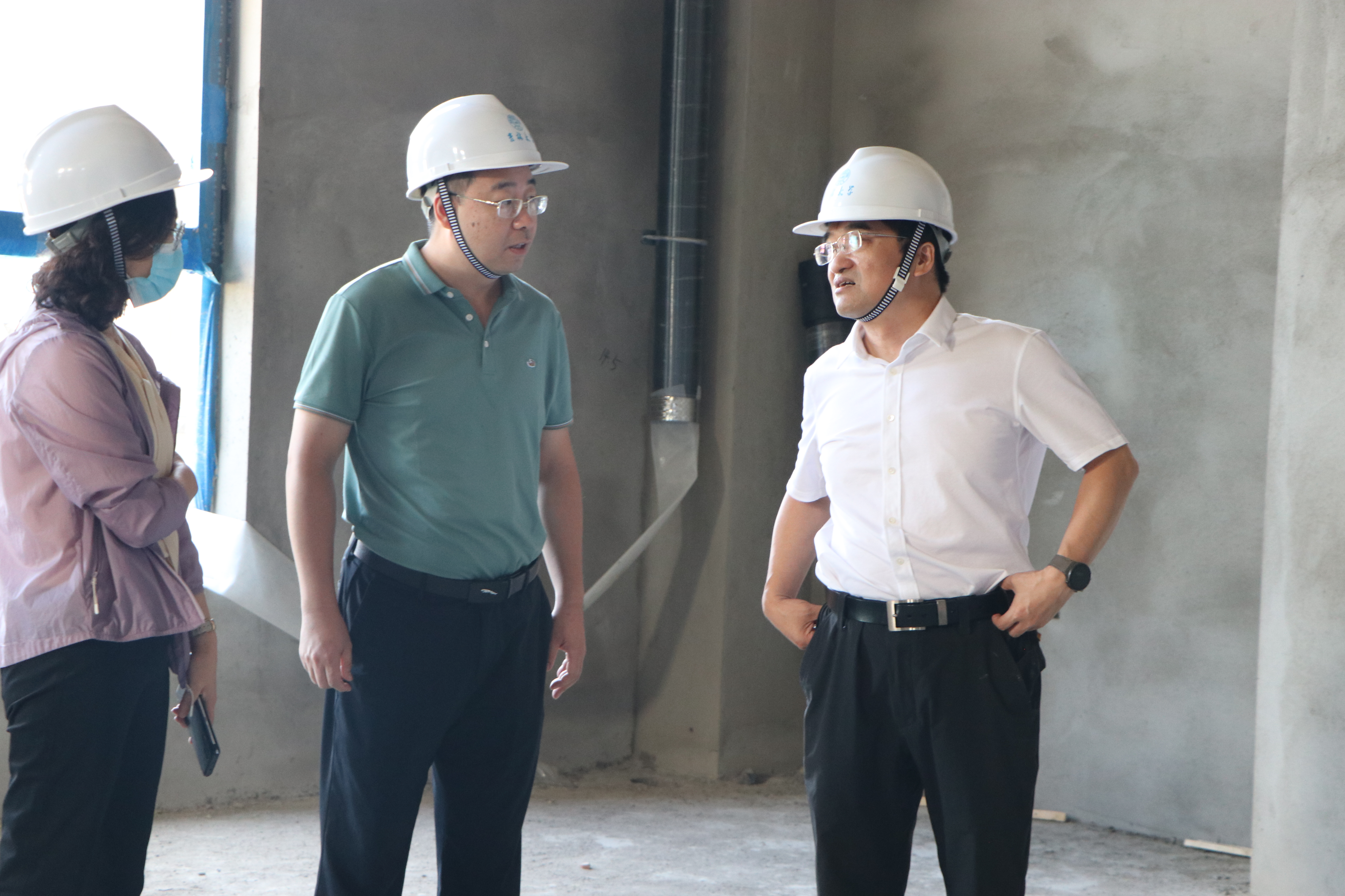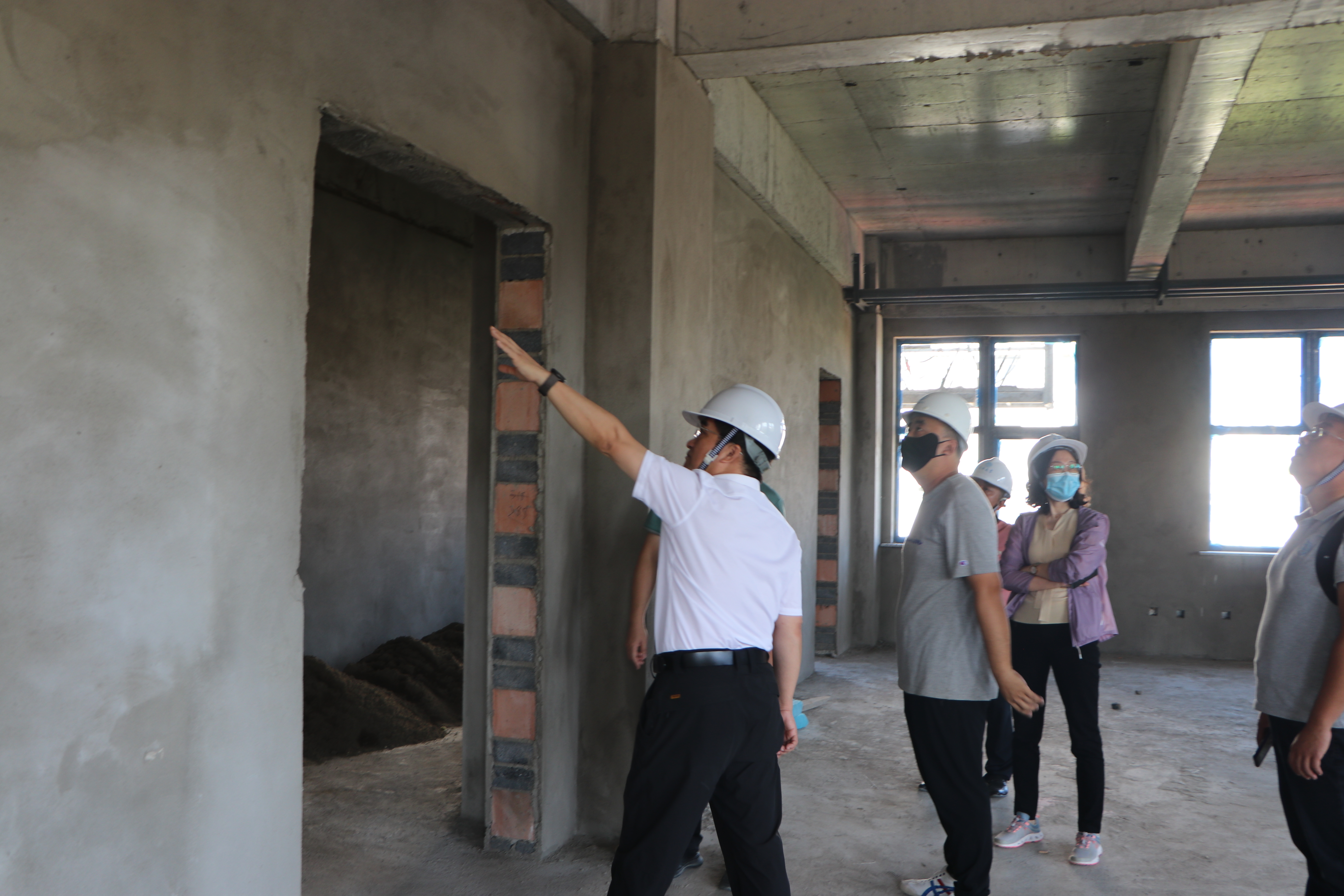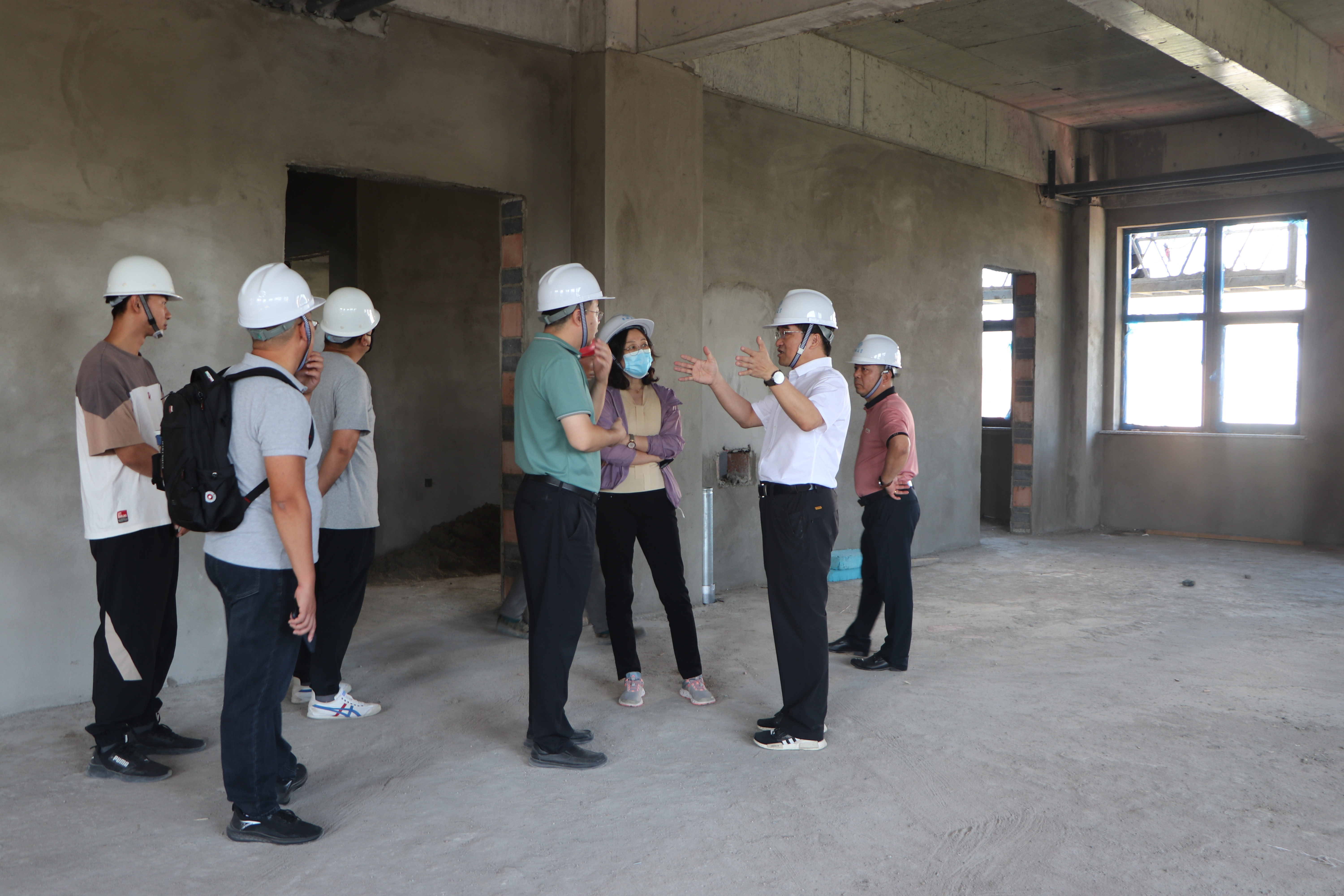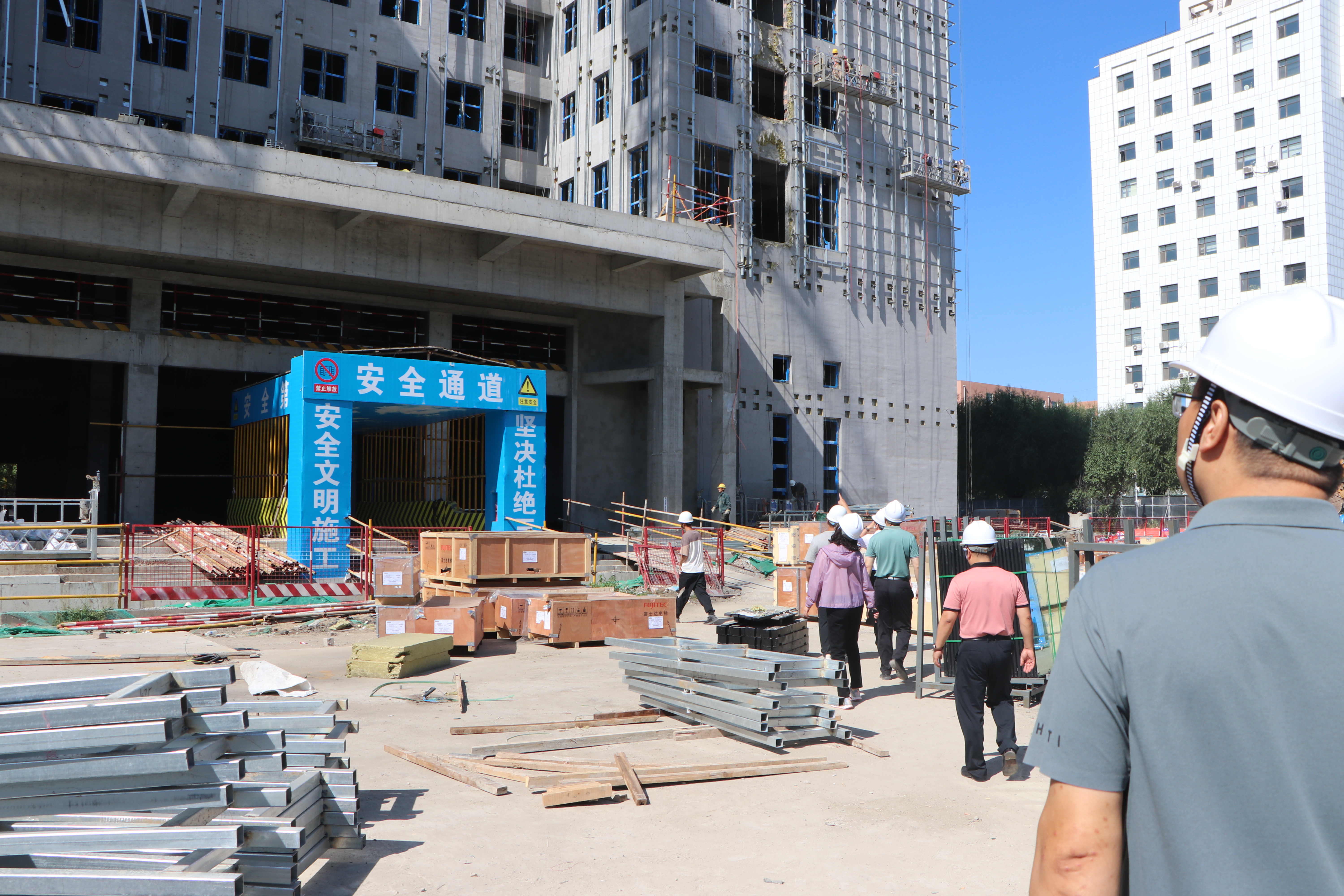 班子成员进入法学楼在建工地现场,了解工程进展情况。目前,法学楼建设施工进度为A栋、B栋外装幕墙龙骨安装、B栋石材开始安装,室内抹灰基本完成,屋面防水已经完成,水暖通风管道正在施工。