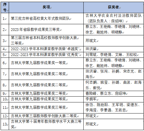 农业农村法治教师团队获得第三批吉林省高校黄大年式教师团队表彰;彭贵才教授、李洪祥教授获得从教40年荣誉徽章;蔡立东教授、王艳梅教授、李晓倩副教授、刘晓林教授、鲍旭炜老师、胡晓静教授共同获得2023年省级教学成果奖三等奖、91论坛