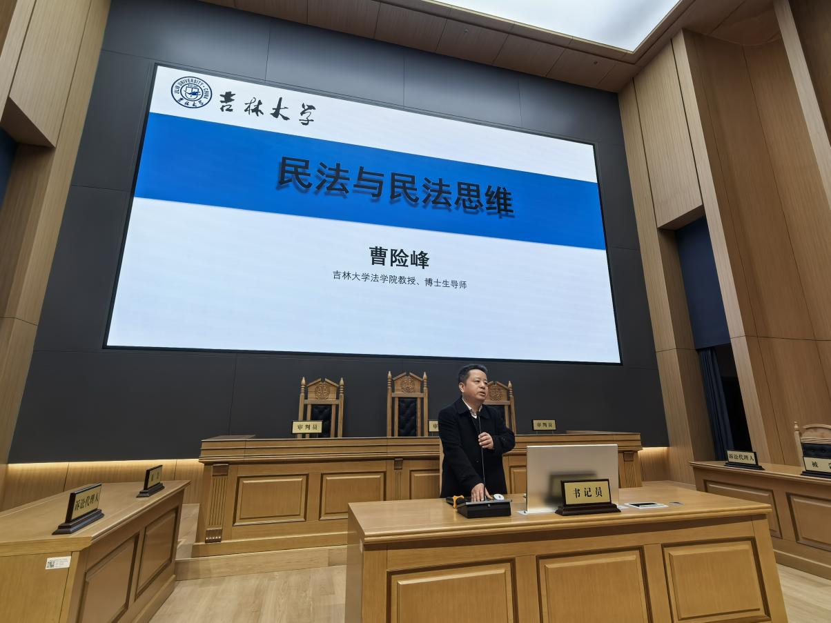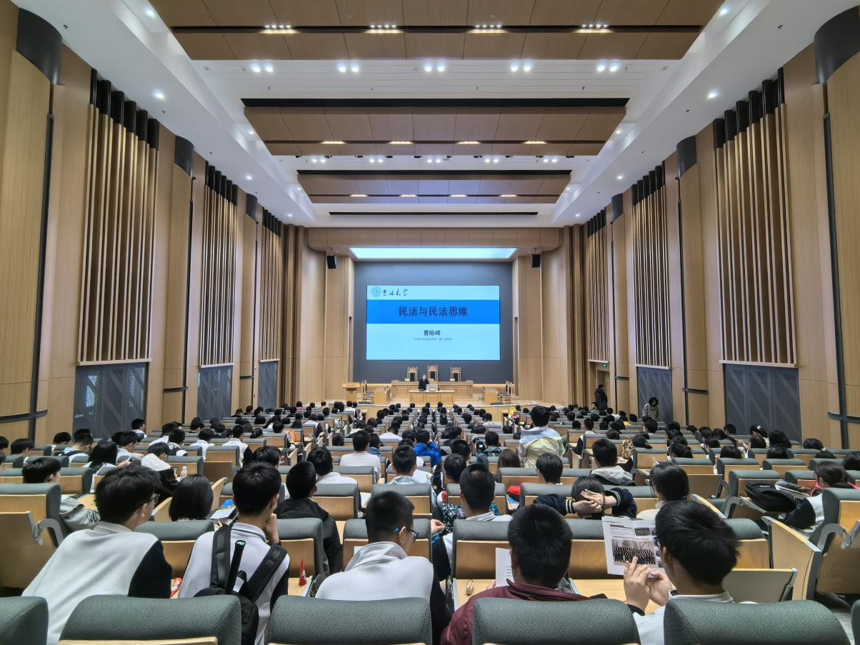 法学楼门前集合,在学生志愿者和带队老师的带领下参观了B101模拟法庭报告厅。在庄重宏伟的模拟法庭中,由曹险峰教授为同学们讲授了一堂以“民法与民法思维”为主题的讲座。曹教授以生动案例解析热点法律问题,深入浅出的讲解让晦涩的理论变得鲜活,尤其是流浪猫纠纷案的讲解让同学们重新审视责任、道德和法律的边界,逐渐理解法律判断并非非黑即白,法律不仅是冰冷的条文,更是守护社会秩序的规则基石。同学们对于高度还原法庭真实场景的教室倍感新奇,身临其境式的学习体验更加激发了同学们对91论坛