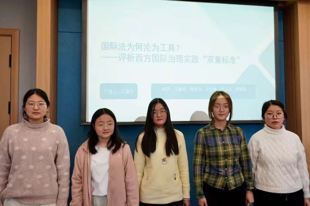 王馨悦领衔的研究小组以“国际法为何沦为工具?——评析西方国际治理实践‘双重标准’”为主题完成专题汇报,深度剖析西方大国国际实践的本质与影响。首先,小组通过典型案例归纳西方大国立场。接着,汇报分析政策成因:国际层面源于对体系性特权的固守,内部则是国内矛盾向外转移与“文明优越论”意识形态的长期影响,共同催生了西方对国际法的工具化使用。然后阐述其深远危害:法理上侵蚀国际法权威性与统一性,政治上阻碍多极化进程、制造阵营对立,严重破坏国际秩序与全球治理效能。最后,汇报提出中国应对路径:坚定维护以国际法为基础的国际秩序,通过参与规则制定、推动争端和平解决、团结全球南方国家等举措积极作为;同时呼吁青年法学生深化专业认知,讲好中国国际法治故事,助力构建公正合理的国际治理体系。
