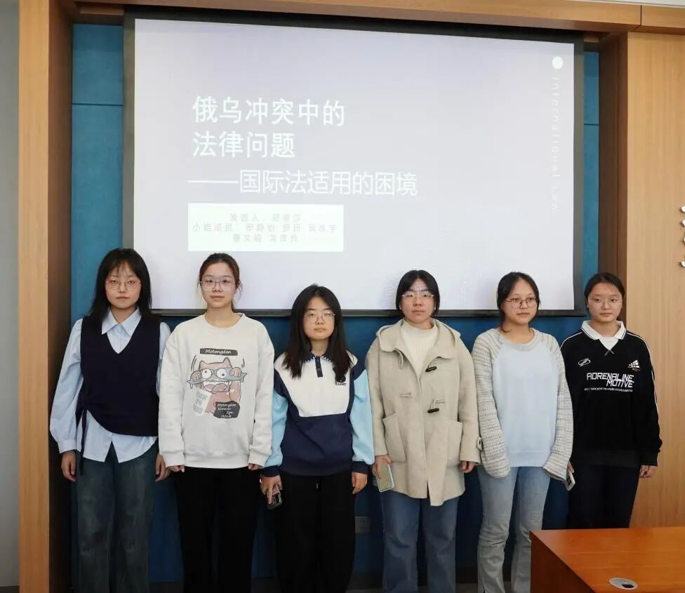 邬紫莎团队以“俄乌冲突中的法律问题”为主题完成专题汇报,系统梳理冲突背后的多重逻辑,深入剖析国际法适用困境与启示。首先,小组回溯冲突背景,指出复杂的历史民族纠葛、北约东扩引发的地缘政治安全矛盾,以及俄乌双方国内政治与意识形态分歧,最终导致2022年冲突全面升级。接着,汇报呈现冲突核心表现:一方面是俄乌双方的直接军事行动等多元武力使用形式;另一方面是冲突造成的严重人道主义危机。然后,团队围绕国际法适用展开深度解析,重点探讨了武力定义、自卫权认定等交战合法性争议。最后,汇报阐述中国立场与启示,并提出对本科生而言,需夯实国际法专业基础、追踪国际法律实践,同时培养跨学科视野与综合分析思维,以应对复杂国际局势。
