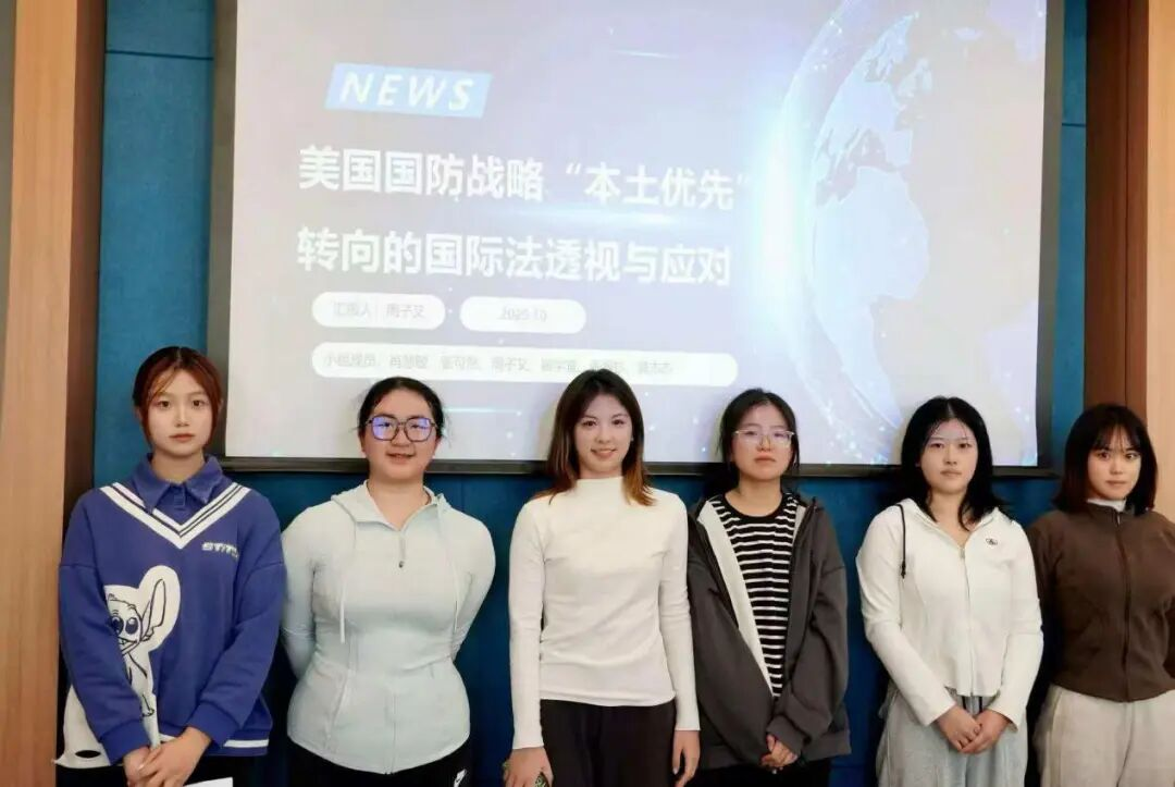 周子又团队围绕“美国国防战略‘本土优先’转向的国际法透视与应对”完成专题汇报,系统剖析战略转向背后的法律逻辑与国际影响。首先,小组梳理战略转向的核心动因,并深入分析战略转向的法律依据及局限性。然后,汇报阐述战略转向的连锁影响,包括欧美及亚太同盟信任裂痕,以及区域安全规则冲突、多边机制权威弱化、跨界损害争议等衍生法律问题,凸显国际秩序面临的碎片化风险。最后,小组提出针对性应对路径:中国应通过精准应对法律争端、强化多边机制参与、依托区域机制构建话语权维护权益;涉外法律专业学生需夯实国际法基础、提升实践能力、培养全球视野,以专业素养回应国际治理挑战。