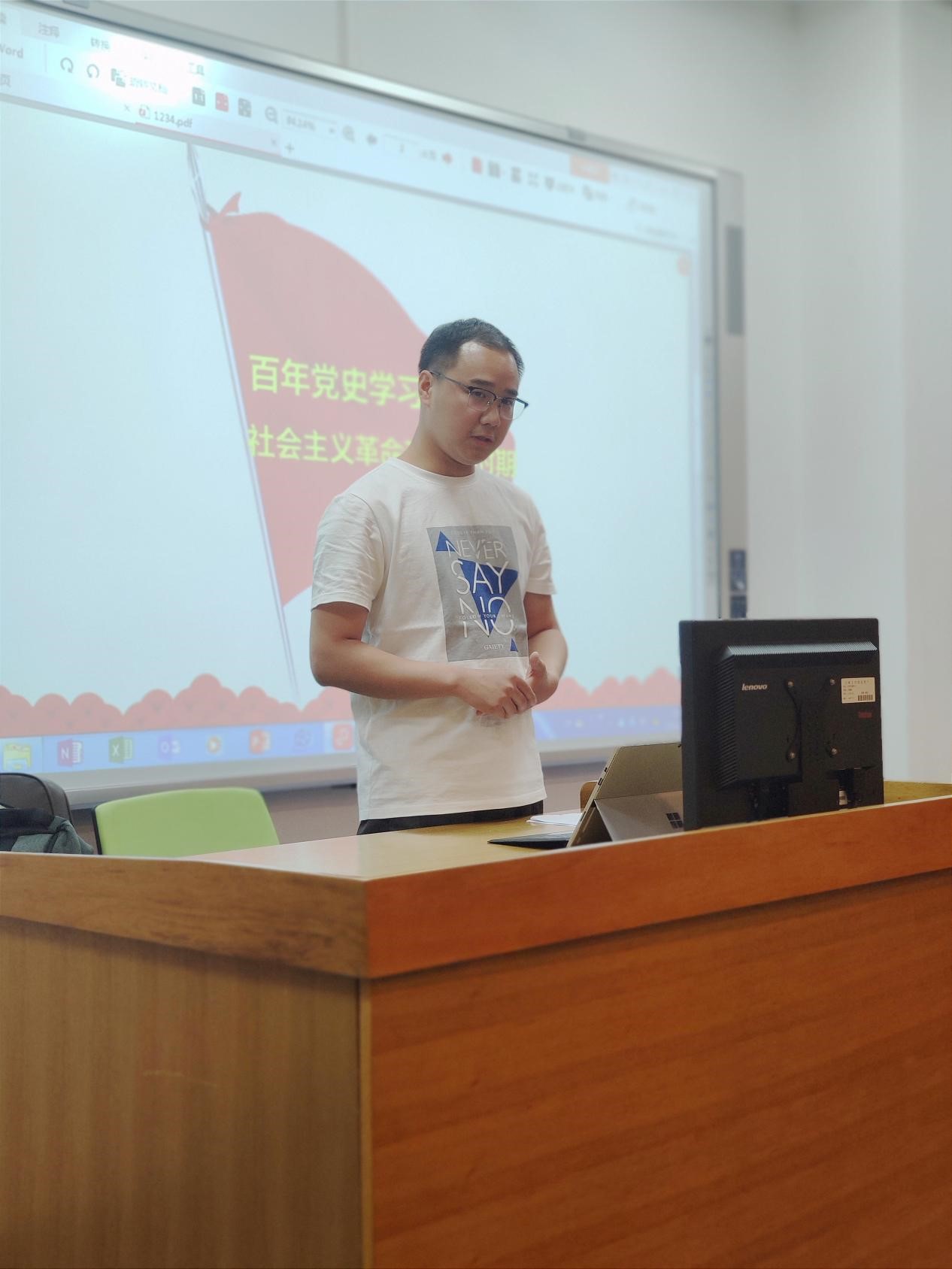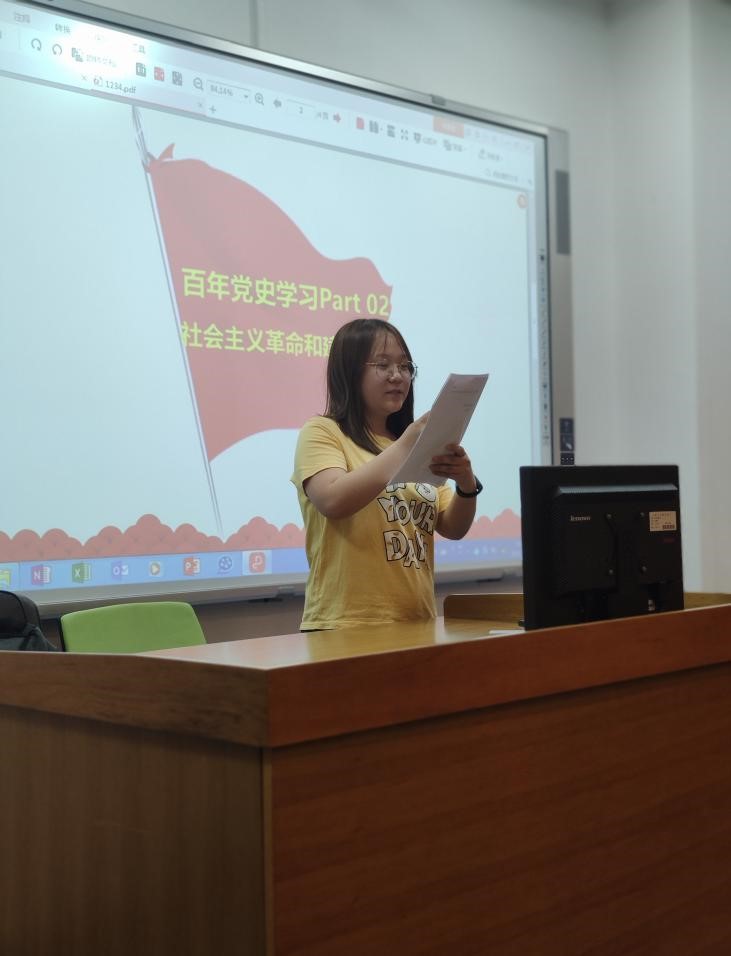 会议伊始,孙光辉同志作为领学人向大家介绍了本次活动的主题,并以时间为轴线梳理了社会主义革命和建设时期的历史。同时分享了对这一历史时期的学习感悟:“我们党在这一时期带领全国人民攻坚克难、直面现实、努力探索,闯出了一条独立自主之路,实现了从新民主主义社会到社会主义社会的过渡,建立了独立完整的工业体系和国民经济体系。我们党在探索建设社会主义的过程中也走过弯路、栽过跟头。作为新时代的青年,我们要学党史悟党史,总结经验吸取教训,坚持以马克思主义为指导,在遵循规律的基础上进行实践探索,在实践中弘扬这一时期涌现出的伟大精神。”
