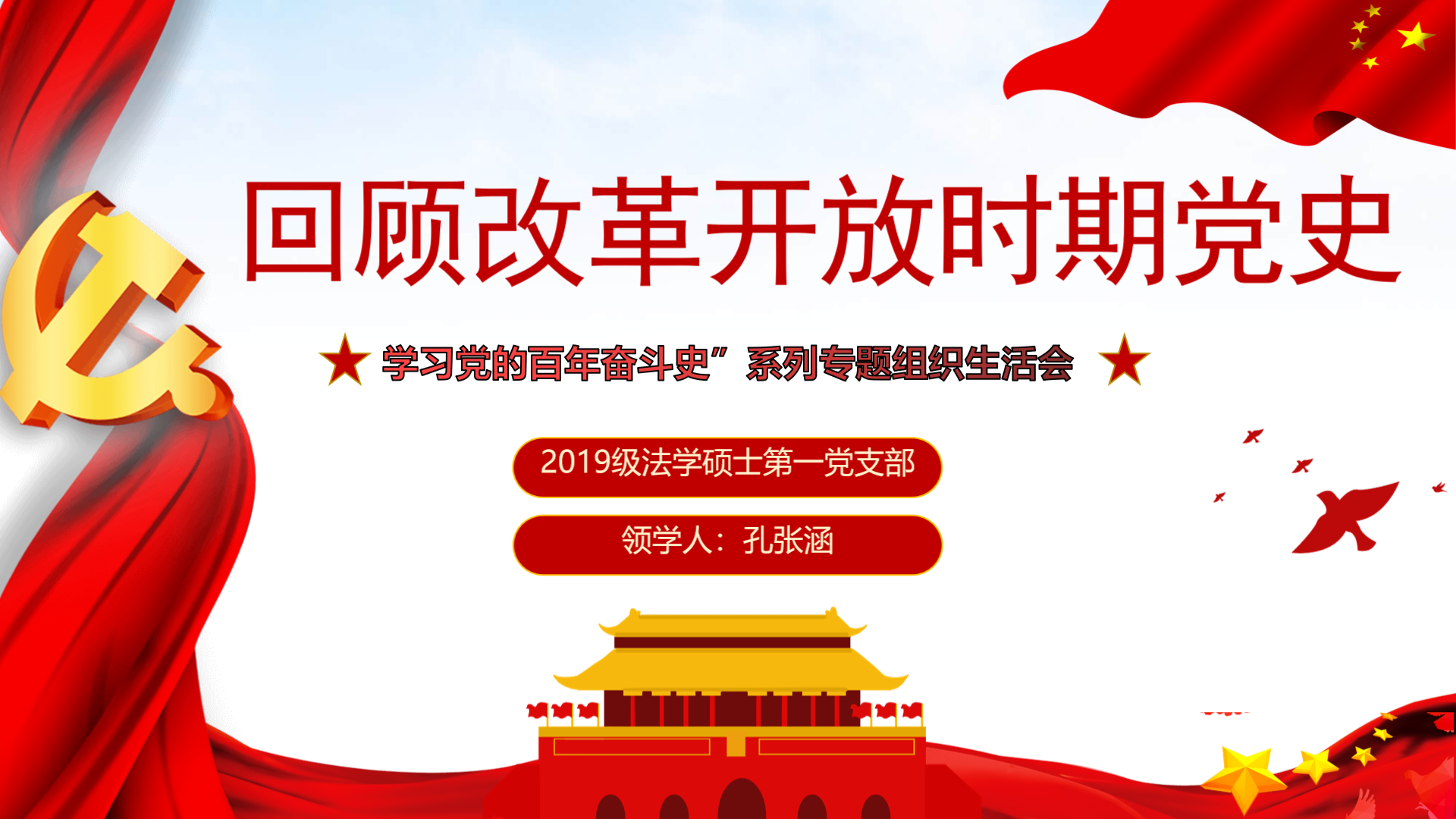 2019级法学硕士第一党支部开展了“学习党的百年奋斗史”系列专题组织生活会之回顾改革开放时期党史。此次会议通过线上视频的方式举行,由党支部书记杨安华主持,党支部宣传委员孔张涵带领大家共同学习。