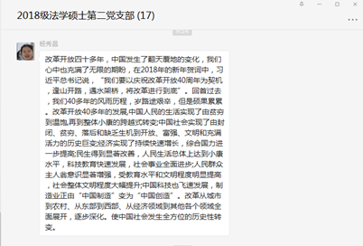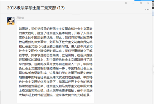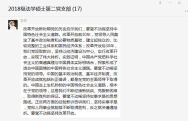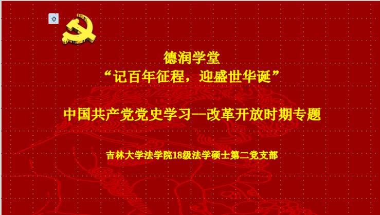 委员会关于在全院开展党史学习教育的实施方案》部署,系统开展全院师生党员要系统学习党的百年奋斗史的活动,2018级法学硕士第二党支部线上开展“中国共产党党史学习--改革开放时期”专题学习。本次活动由支部书记吴金晏主持并担任领学,党支部全体成员共同参与。