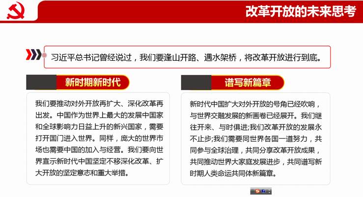 支部书记指出,组织开展改革开放时期历史的学习,有助于我们认识中国人民在中国共产党的领导下,用实践证明,没有改革开放,就没有中国特色社会主义,就没有中国社会主义的现代化。把改革开放贯穿于社会主义社会发展的全过程,就能使中国特色社会主义道路越走越宽广。改革开放是决定当代中国命运的关键抉择,是发展中国特色社会主义、实现中华民族伟大复兴的必由之路。