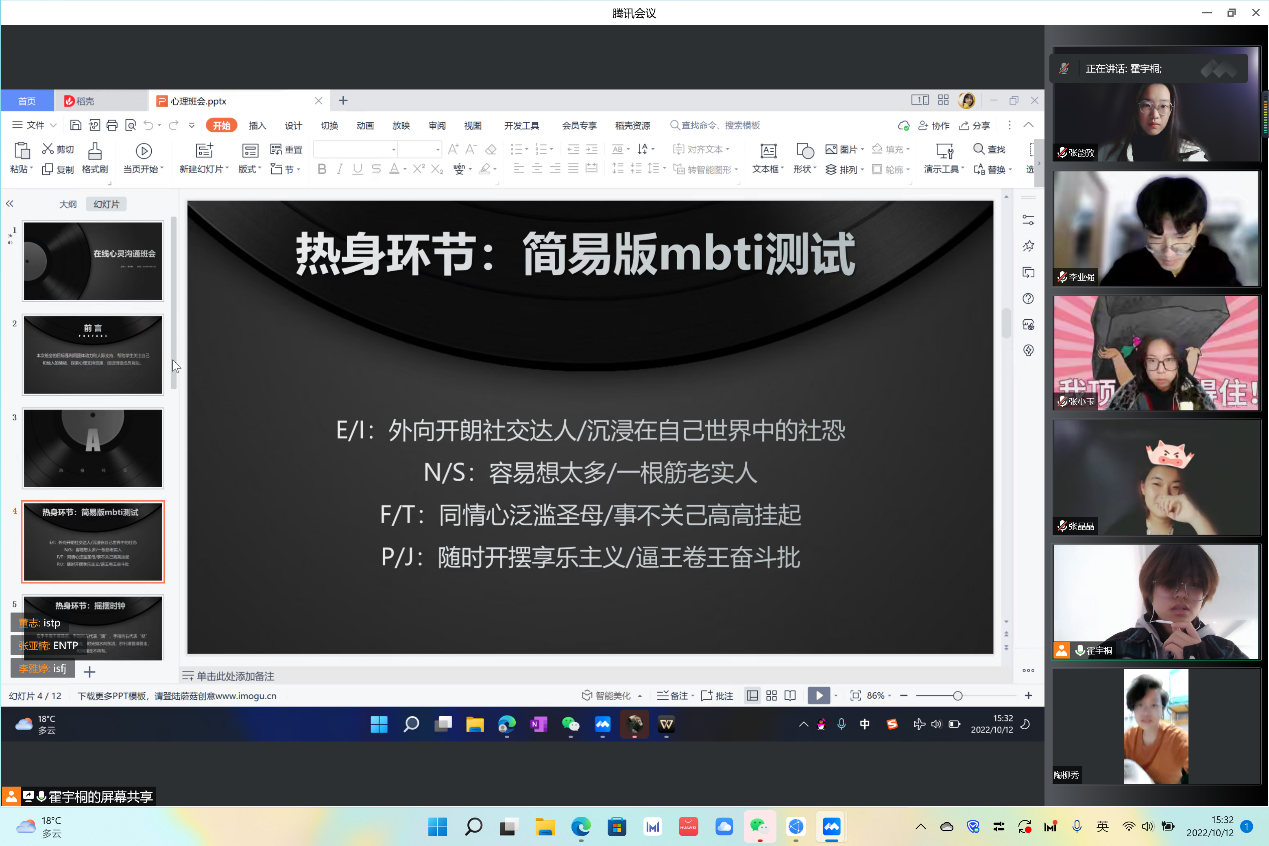 第一环节,主持人带领同学们进行简易版mbti人格测试和摇摆时钟热身活动。在人格测试阶段,同学们纷纷找出自己的人格代称,展开讨论,使大家很快拉近距离,加深对彼此的印象。在摇摆时钟阶段,同学们跟随主持人的示范动作,将双手平展于屏幕前,当主持人念出“嘀”字时,大家手指向左,当主持人念出“嗒”字时,大家手指向右。随着主持人的行动口令越变越快,同学们的动作出错率也越来越高,面对自己的“手忙脚乱”,有的同学忍不住笑了出来。简单的热身小活动既让活动气氛热闹起来,让大家放下拘束,也让大家的身体和大脑迅速动起来,锻炼了同学们的手脑协调能力。