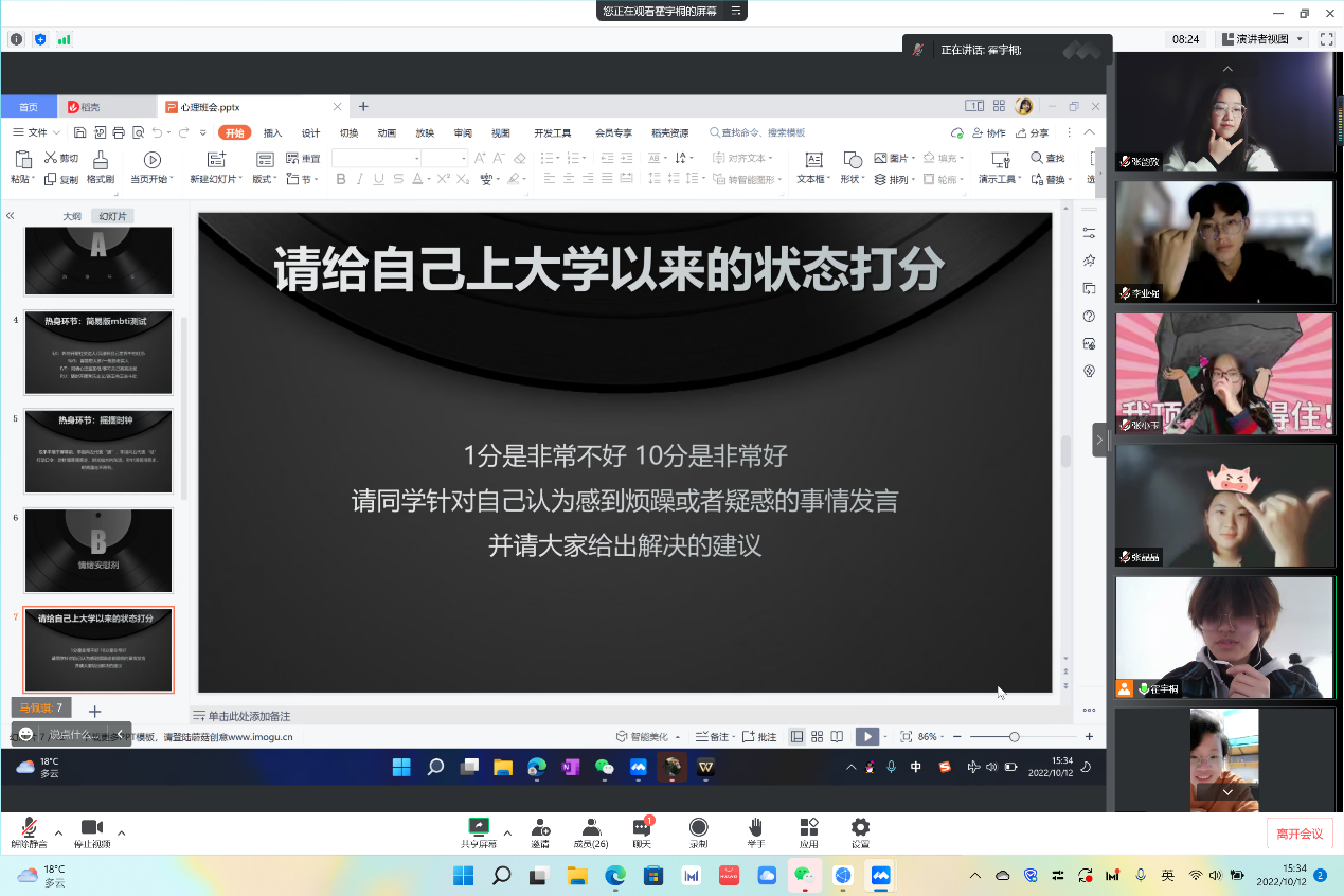 第二环节“情绪安慰剂”中,同学们为自己上大学以来的状态进行打分。同学们的分数不尽相同,一些打分低的同学提出了自己遇到的困惑。主持人和其他参会同学也给出了相应建议,一些打分高的同学则分享了自己上大学以来的愉快经历。主持人总结道:我们每个人都会有积极与消极的情绪,也都会被正面或负面的情境影响,它们的存在自有其意义,大家既要向外寻求心理支持,也要学会向内挖掘自己潜在的力量,做自己情绪的掌控者、管理者和调节者。