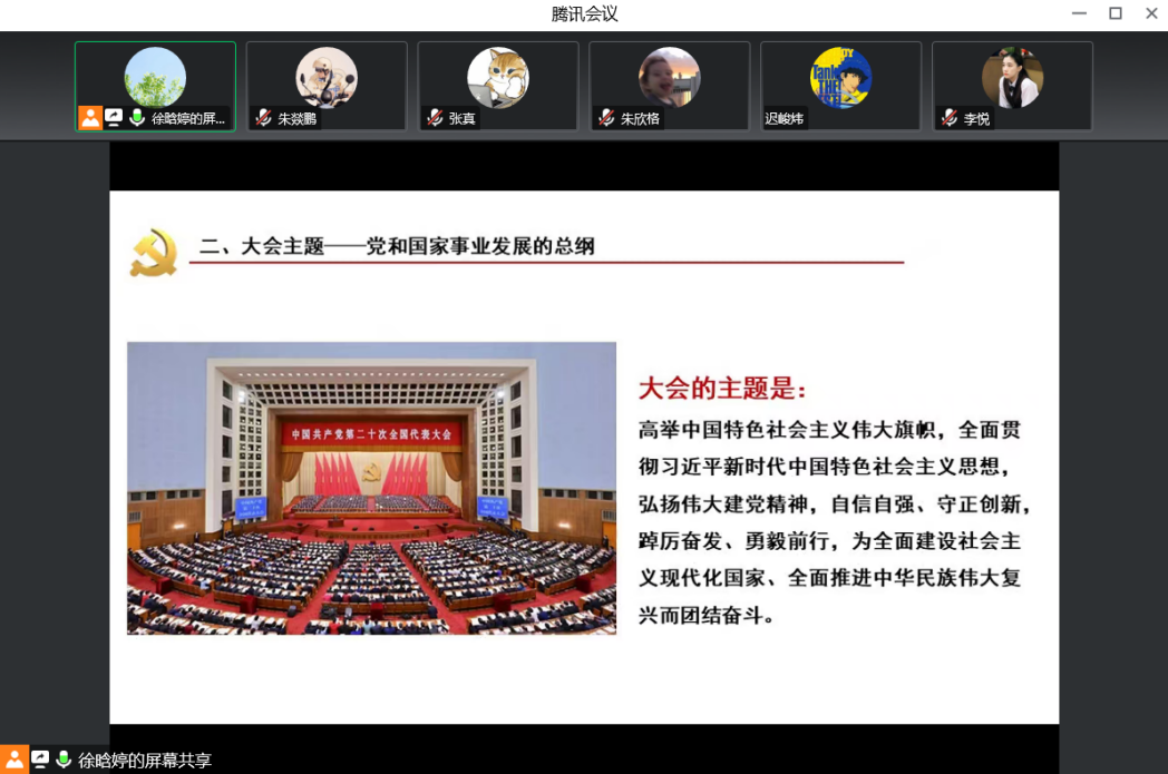 徐晗婷同志以《新时代新征程坚持和发展中国特色社会主义的政治宣言和行动纲领》为题,从战略定位、大会主题、实践基础、理论指导、基本路径、根本保证和团结要求七个方面对二十大报告展开详细讲解。