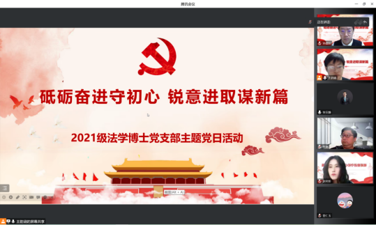 2021级法学博士党支部于2022年11月28日晚召开“砥砺奋进守初心 锐意进取谋新篇”线上主题党日活动,集体学习二十大精神。本次主题党日活动由王韵涵同志主持。支部党员同志围绕这一主题,分享了自己的学习心得与体会。