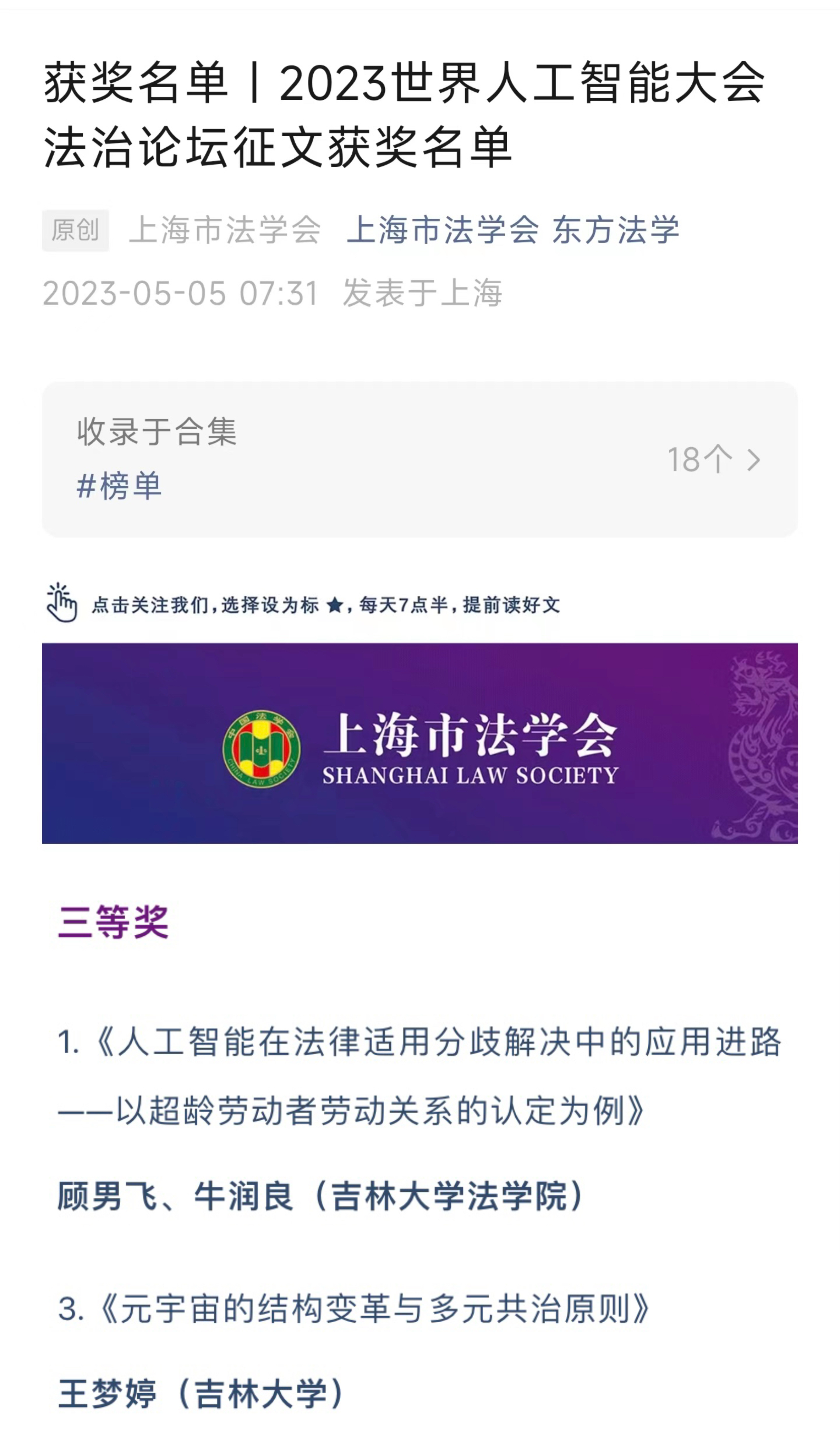 2021级经济法学硕士研究生顾男飞、人工智能学院2022级博士研究生牛润良共同写作的《人工智能在法律适用分歧解决中的应用进路——以超龄劳动者劳动关系的认定为例》荣获三等奖,2021级法律(法学)专业研究生王梦婷写作的《元宇宙的结构变革与多元共治原则》荣获三等奖。