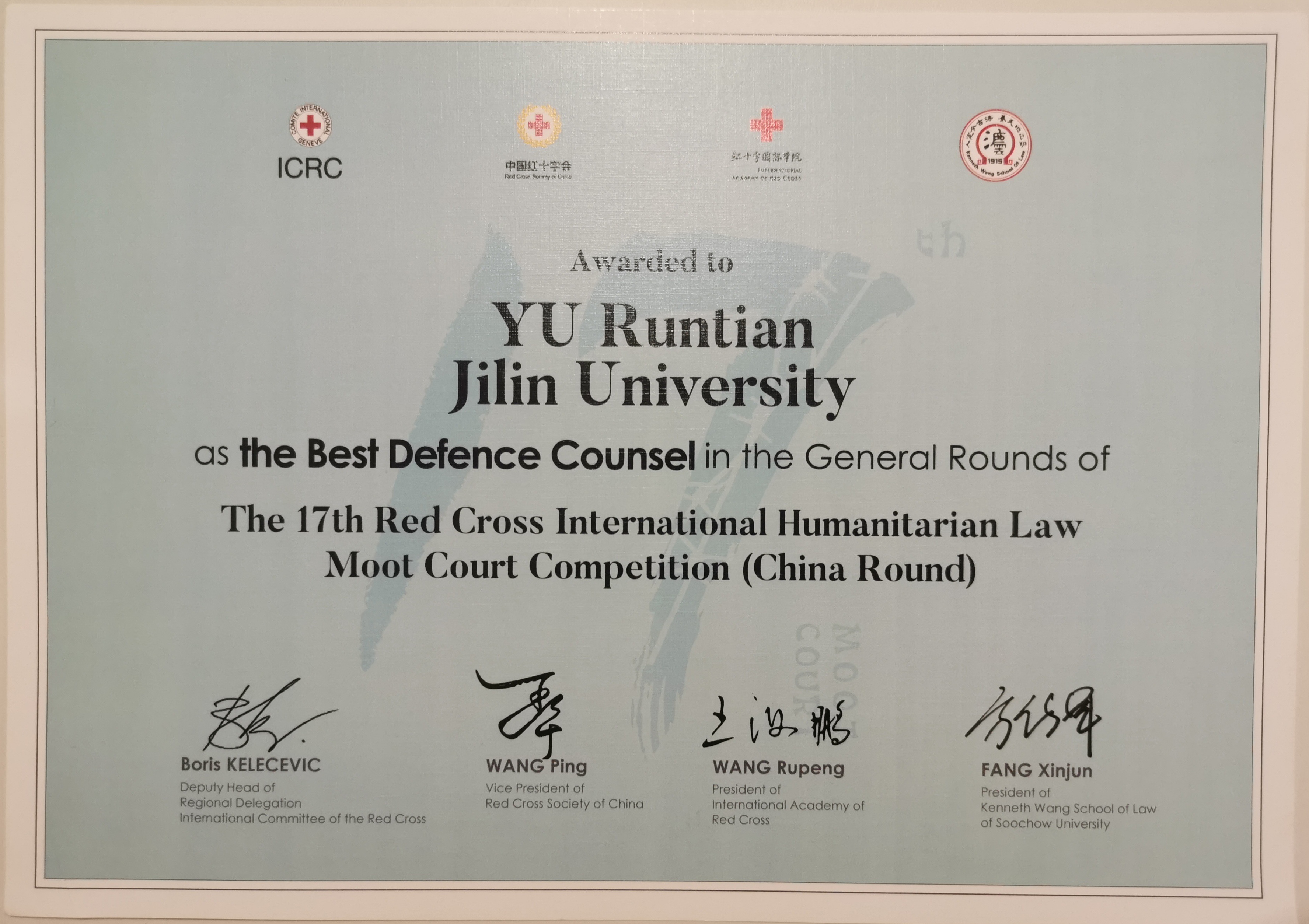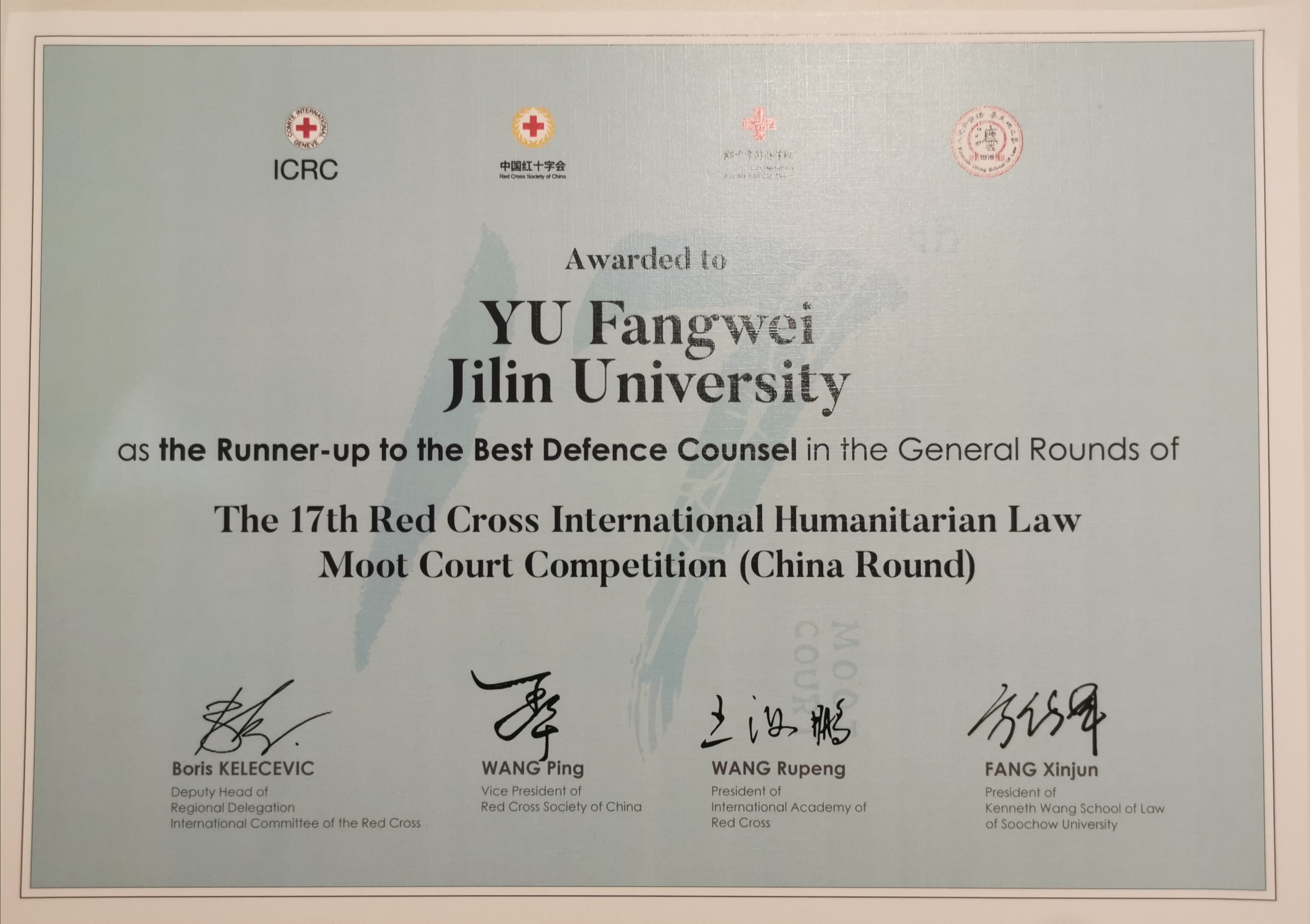 代表队晋级线下庭辩阶段,并经两天五轮的激烈角逐,以循环赛总分第一名、淘汰赛第三名的成绩,荣获赛事全国季军、一等奖,晋级2024年亚太国际赛。同时,两位上场队员以辩方庭辩总分前二名的成绩,包揽辩方最佳辩手的称号。