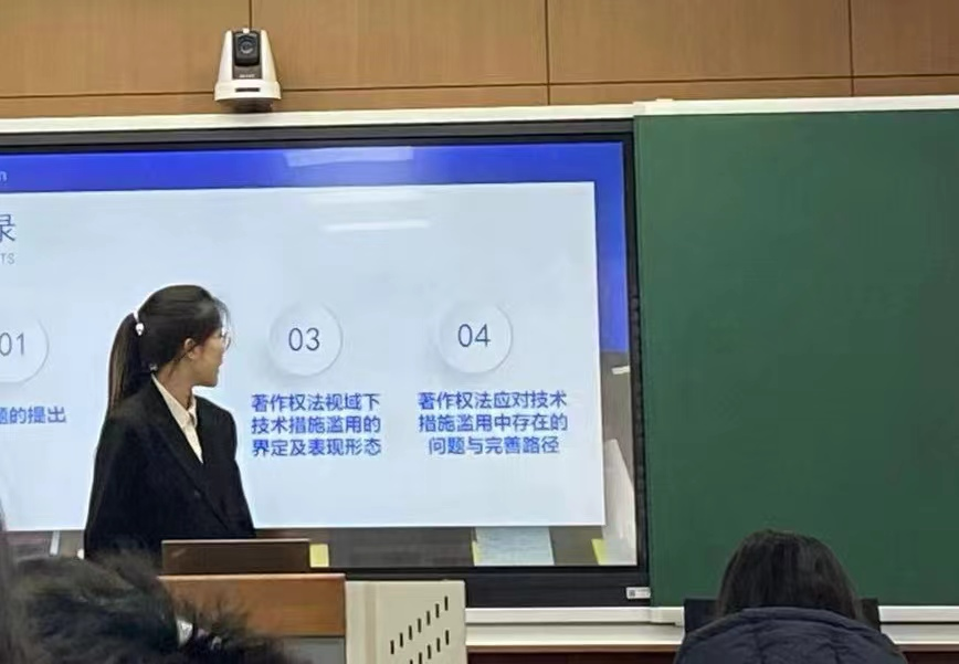 第四组同学汇报的内容涵盖了NFT作品转售适用数字权利穷竭制度的著作权法构建、著作权权利人错误通知的侵权责任认定、数字时代技术措施滥用的著作权法应对以及著作权法中表达公有领域的司法认定。在评议环节,老师指出选题的核心词不宜过多,要避免论文结构混乱。此外,需要加强对于法学基础理论的学习和掌握。李建华教授特别强调,论文标题中应避免出现回应、规制、应对、演进等用语,需要将问题具体化。