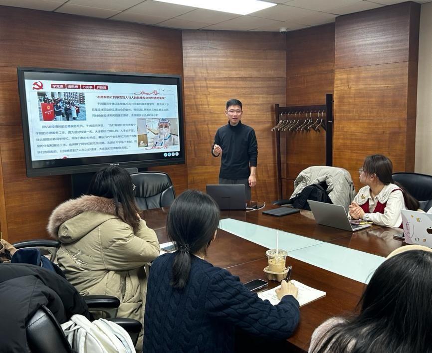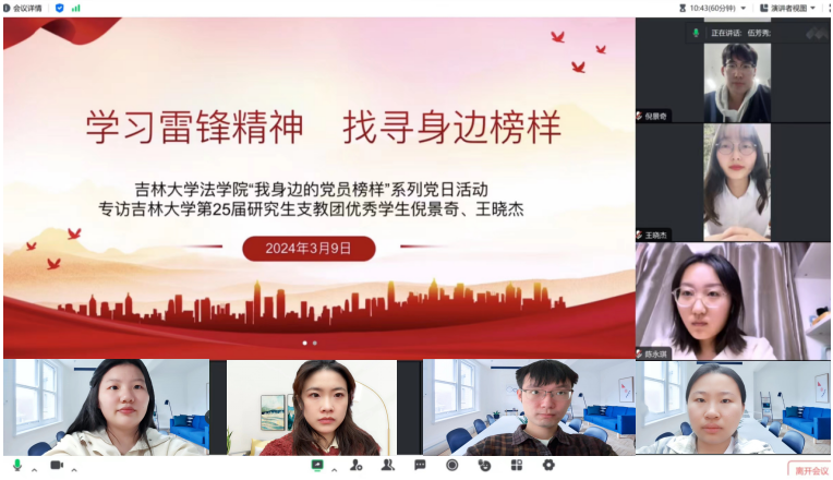 第25届研究生支教团代表倪景奇、王晓杰。两位同志讲述其扎根基层、建设西部、投身乡村教育帮扶的优秀事迹,一代代志愿者以实际行动践行雷锋精神的动人故事深深感染支部内的每位同学。第四党支部分别采访了老党员邢云发和青年党员于润田、蔡储彬。邢云发同志坚守辽河边,近50年搭救溺水群众32人,生动诠释共产党员的忠诚担当;于润田、蔡储彬同志积极投身志愿服务、广泛参与各类学术活动,展现法学学子的青春力量。榜样领航,助力成长。