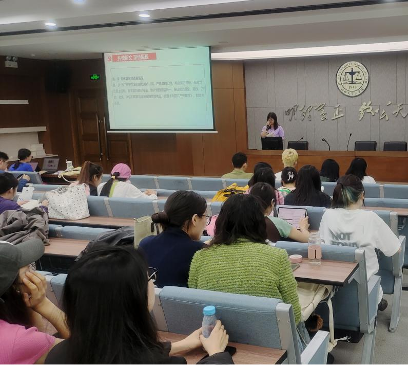 2023级法律硕士(非法学)第二学生党支部书记刘海霞针对《中国共产党纪律处分条例》原文中的重要内容讲授专题党课,着重理清《条例》修订背景,对于新修订《条例》的亮点进行深入解读。在学深学透、掌握具体条文内涵的基础之上,进一步明确:了解纪律是前提,遵守纪律是关键。全体党员和积极分子应将纪律规矩落实到工作和生活之中,不断提高自身的党性修养和纪律意识。