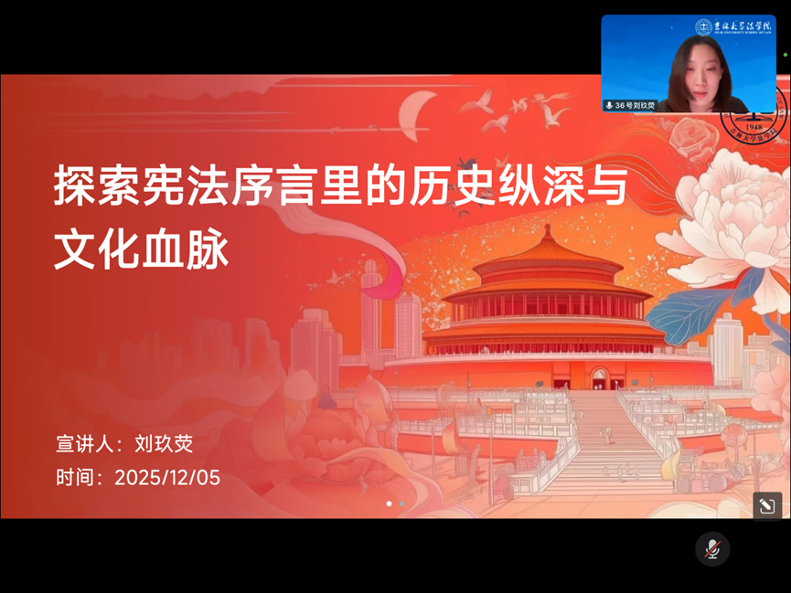 刘玖荧同学以宪法序言为切入点,从近代中国的苦难与奋斗到新中国成立的历史进程,呈现序言所凝结的国家发展轨迹与时代精神。同时,她结合马克思主义中国化和文化自信阐释我国文化根脉,以通俗讲述与生动案例讲述宪法序言的时代意义与青年担当。