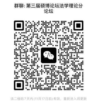 论坛对象包括2022级由所有法理学科导师指导的硕士生、博士生(含法硕、司法文明、涉外律师以及非全日制)。请各位同学及时扫码入群(入群后请在“我在本群的昵称”中写明“博士/学硕/法本法硕/非法本法硕+姓名”,如:博士张三)。