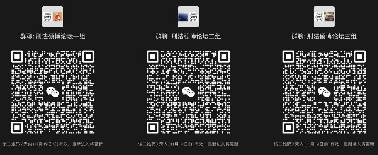 刑法学专业老师指导的全体硕士、博士研究生。全体同学共分为三组(具体分组情况详见附件),请各位同学按照分组扫码进入微信群。