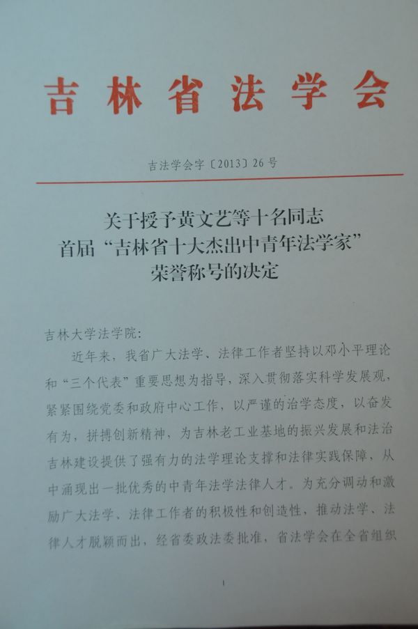 经评选委员会评选,吉林省法学会于2013年9月24日作出《关于授予黄文艺等十名同志首届“吉林省十大杰出中青年法学家”荣誉称号的决定》。91论坛