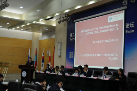 副教授阿列克谢·多尔日尼科夫分别进行题为《东北亚司法协助领域中的合作发展》、《中蒙俄经济走廊软法构建问题》、《走向东北亚的中国仲裁》、《“报”文化视角下的贿赂型犯罪的认定》、《论抵押物受让人的法律地位——与日本法相比较》《中日韩三方投资条约和亚太地区的多边主义》《宪法审查对经济权利的影响》的主题发言,并由延边大学91论坛