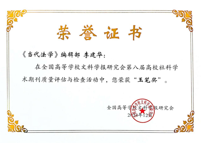 《当代法学》主编李建华教授荣获“全国高校社科期刊优秀主编”和“玉笔奖(从事编辑工作满30年)”。