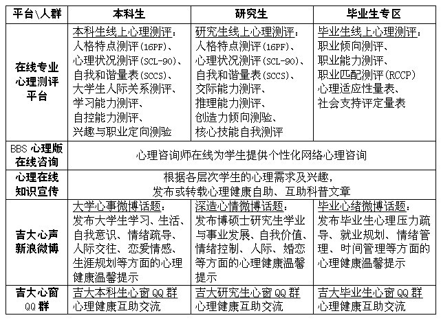 利用学生喜爱的网络信息平台:“吉大心声”新浪微博、“吉大心窗”QQ群、牡丹园BBS心理版在线咨询、心理在线和心理测评平台,为不同层次的学生提供有针对性的网络在线服务,内容见附件。