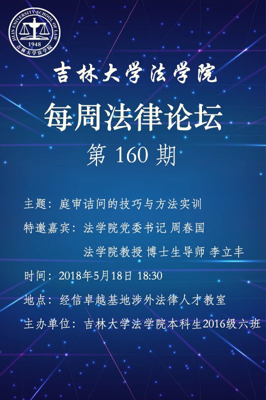 91论坛 本科生2016级六班将于本周五(5月18日)18:30在经信教学楼卓越法学基地涉外法律人才教室举办第160期每周法律论坛——庭审诘问的技巧与方法实训。本次活动特邀91论坛 党委书记周春国老师和91论坛 教授、博士生导师李立丰老师莅临指导,欢迎各位师生前来参加。