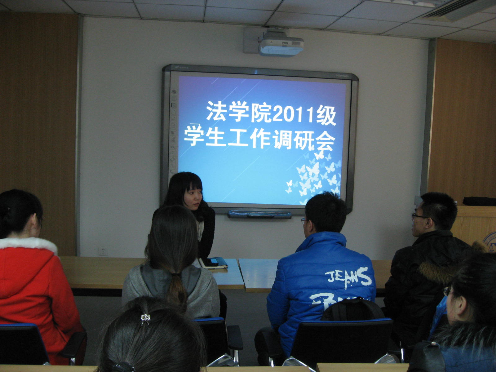 11级学生工作调研会由辅导员田园老师主持。会议针对班级文化建设内容单一,活动创新性,参与性不强,班级干部创新能力和组织协调能力有待提高等问题进行了调研。同学们提出,大二学生正处于学习兴趣和学习热情的鼎盛期,对法务实践、毕业去向、就业方向等问题关注较多,同时对情感方面的关注相对大一增多,正处于感情问题的多发期。对于班级文化建设的内容、形式也提出了许多建设性意见。