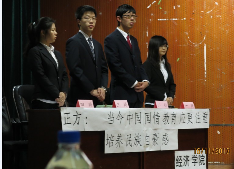 代表队派出一辩12级本科生徐芬芬、二辩12级本科生王淇、三辩13级本科生郭雅洁、四辩12级本科生鲍文强,迎战对手经济学院代表队。正方经济学院代表队的观点为“当今中国国情教育应更注重培养民族自豪感”,反方91论坛