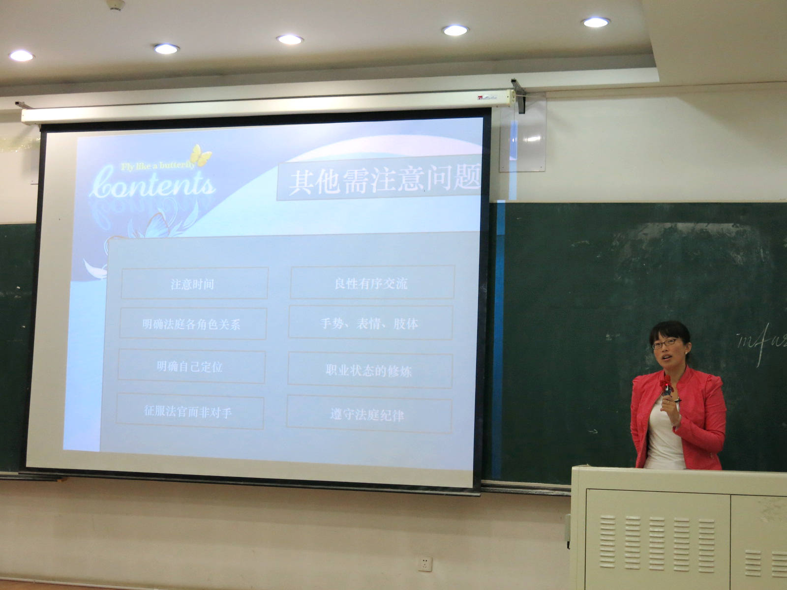 在最后一部分中,田老师提醒了其他的一些应该注意的问题:第一依旧是要注意时间;第二是明确法庭上各个角色之间的关系,律师要以法官为中心,无条件服从法官的一切程序性和形式性的要求,切忌与法官争论;三是明确作为代理律师自身的定位,最主要的是把自己的任务出色地完成,把自己该陈述的陈述清楚、该争辩的争辩明白;四是以征服法官而不是征服对方律师为主要目标,庭审中律师的最主要目标是说服法官而非把对方律师驳倒,因此要在庭审中时刻与法官保持良性的沟通,切忌与对方律师过多纠缠而忘记了出庭的主要任务;五是与法官保持良性有序的交流,不管对手如何表现,己方要始终保持克制和冷静,始终理性地向法官表达己方观点;六是在庭审中注意手势、表情和动作等肢体语言,切忌因为这些细节没处理好而影响全局;七是勤于进行职业状态的修炼,逐渐使自己由一名青涩的法科学生向一名职业法律人转化,培养职业法律人独特的气场;八是要在庭审中遵守法庭纪律。